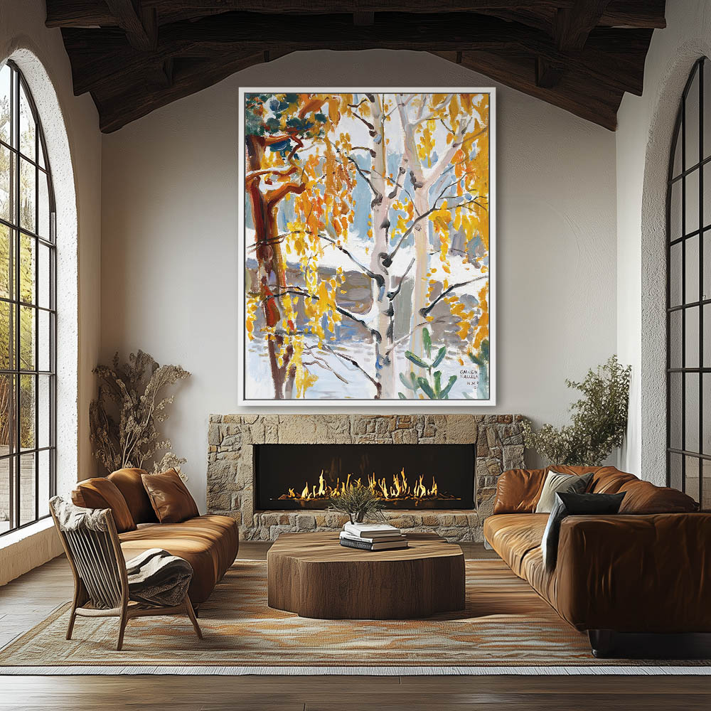 Landscape Painting with Lake Trees and First Snow of the Winter