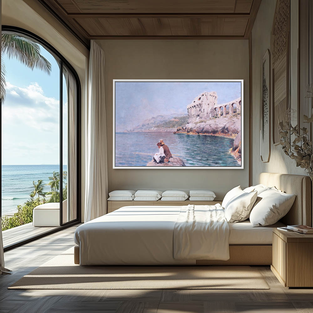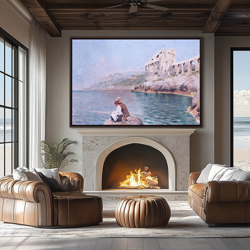 A Coastal Painting of Figures Fishing in the Sea with Ruins in the Back Ground
