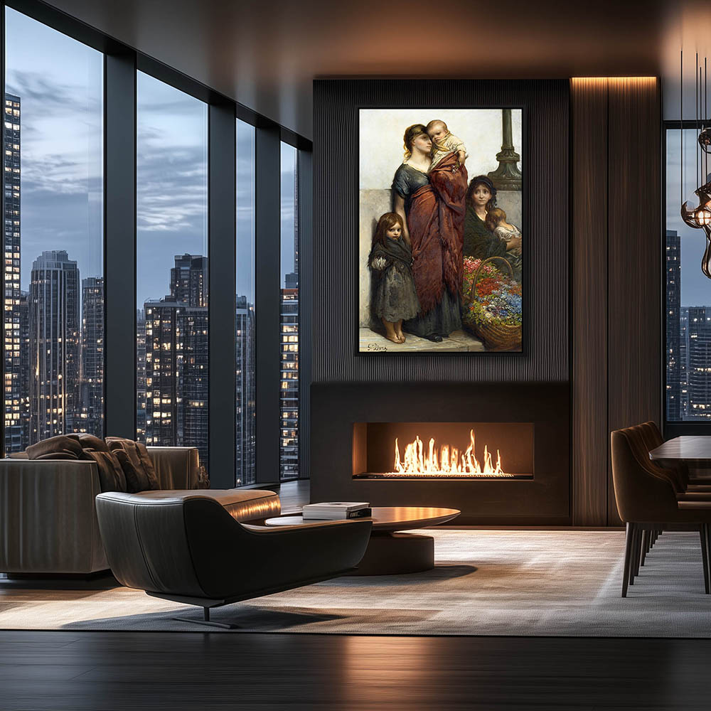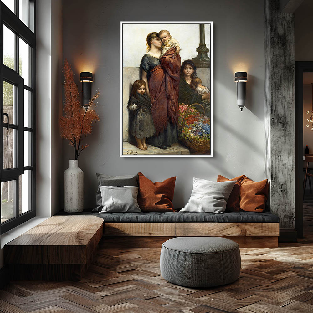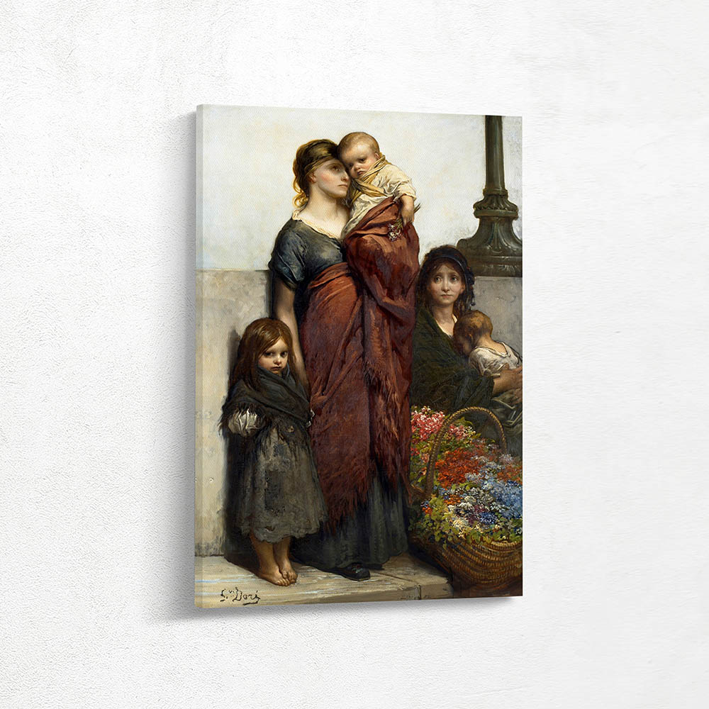 A woman and her children with a basket of flowers to sell