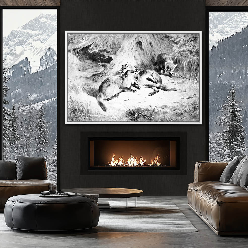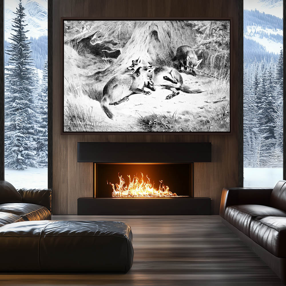 Painting of Foxes at the Den in Black and White