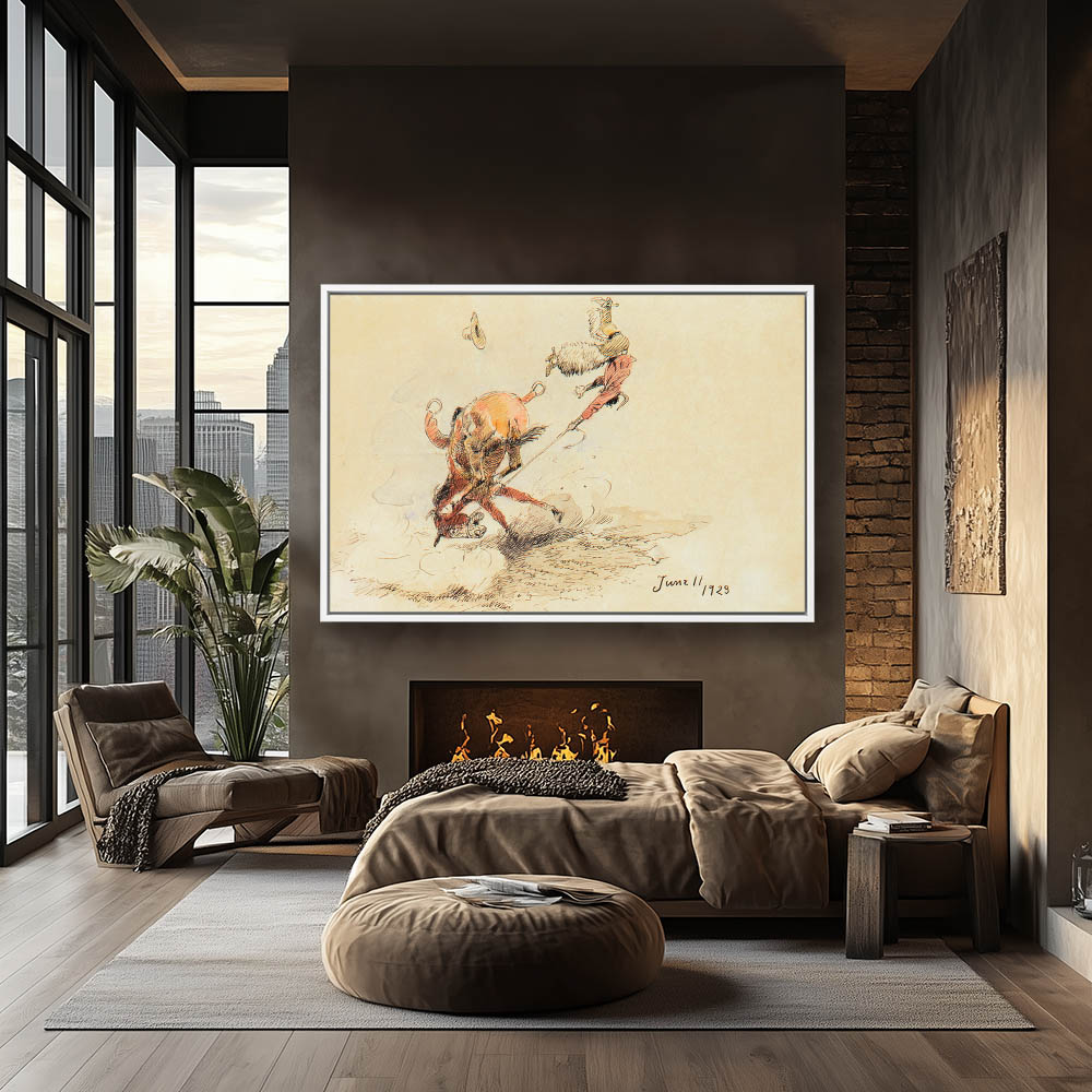 Ink and wash sketch of a horse bucking a rider