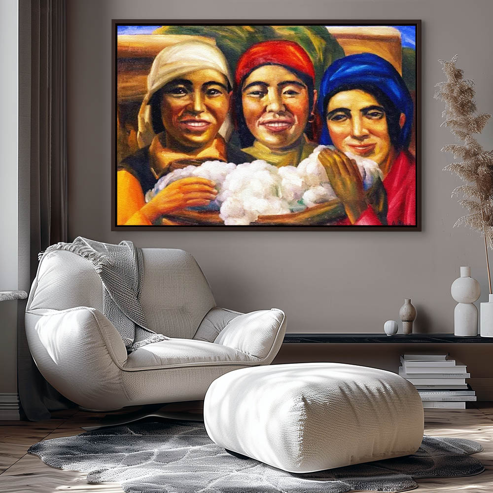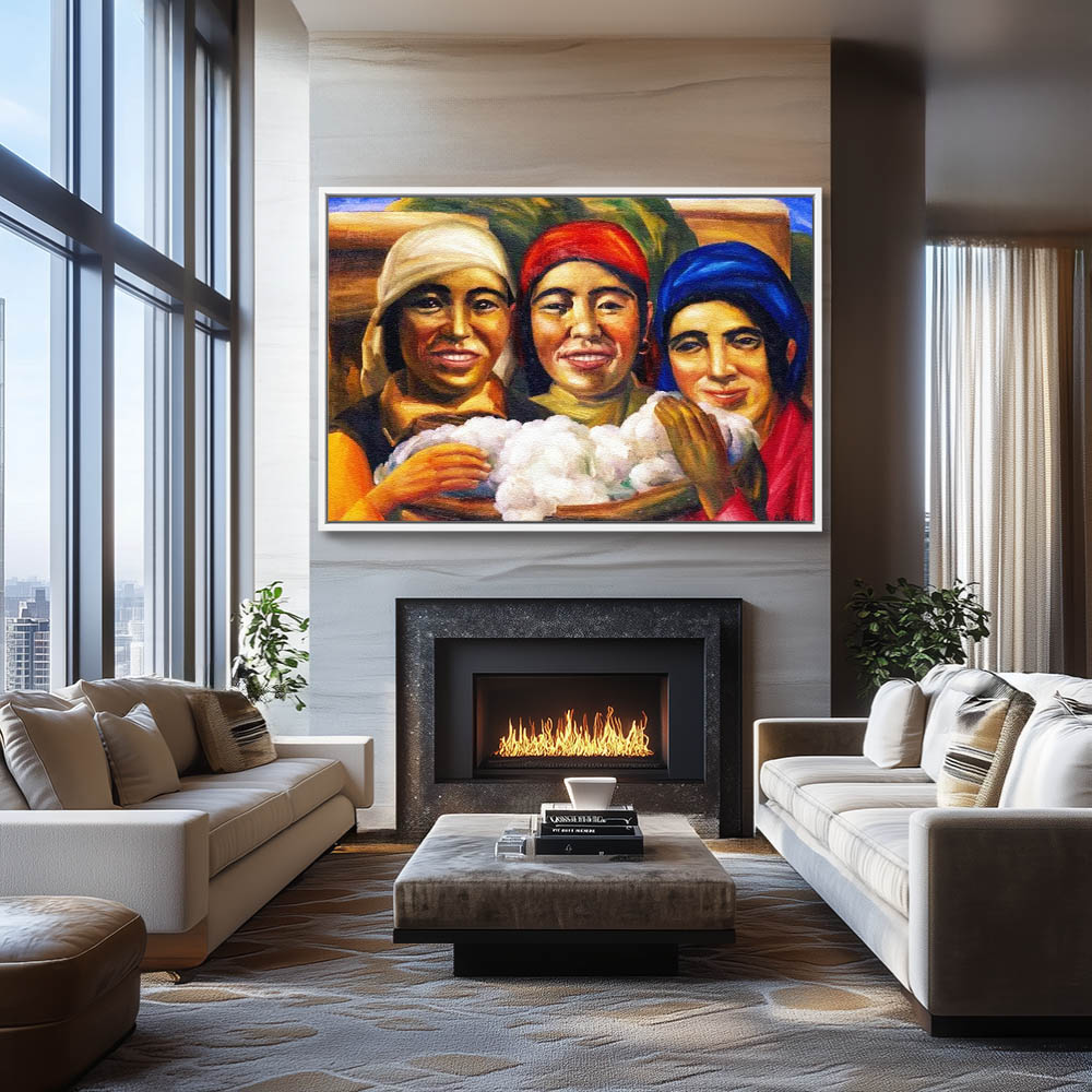 Abstract Figurative Painting of Three Girls Holding Cotton