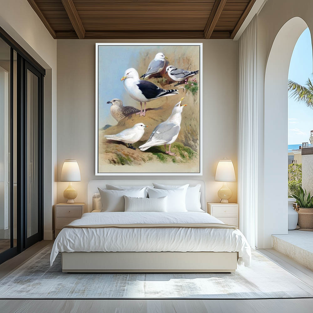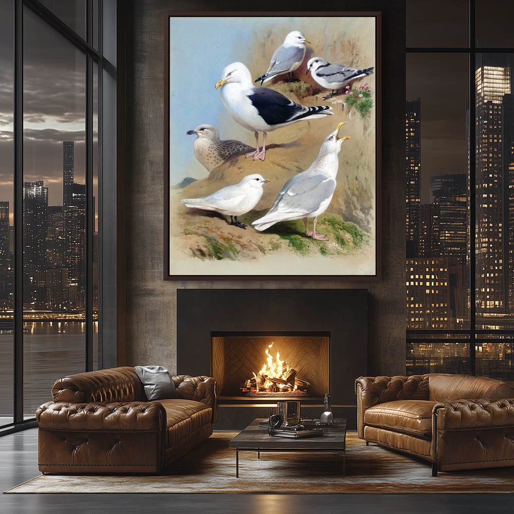 Painting of Various Gulls on the Cliffs on Shore