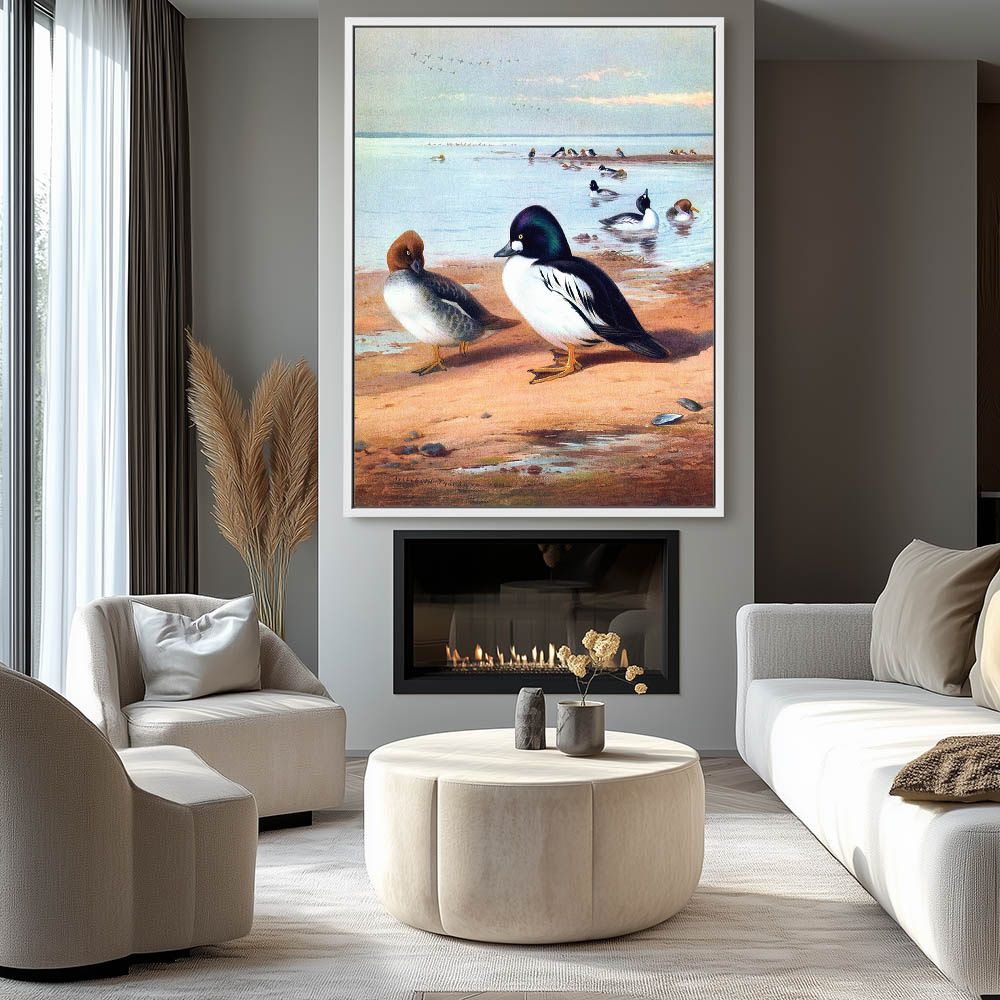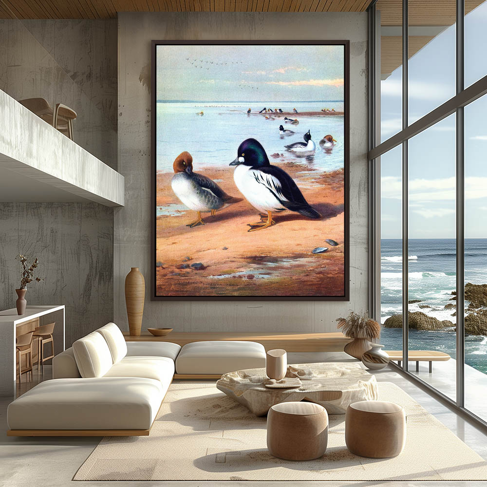 Coastal Landscape Painting with Ducks on the Shore and Swimming in the Water