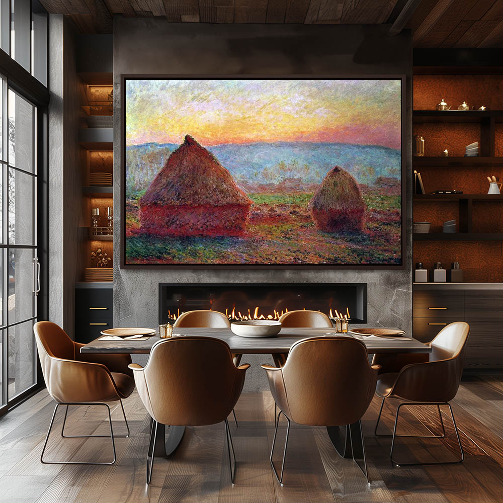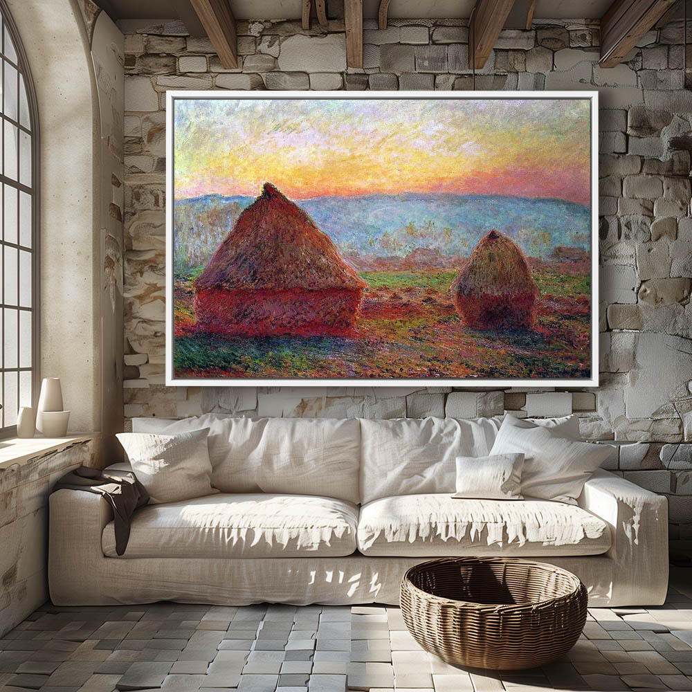 Vintage Landscape Painting with a Grainstack in Ginervy at Sunset