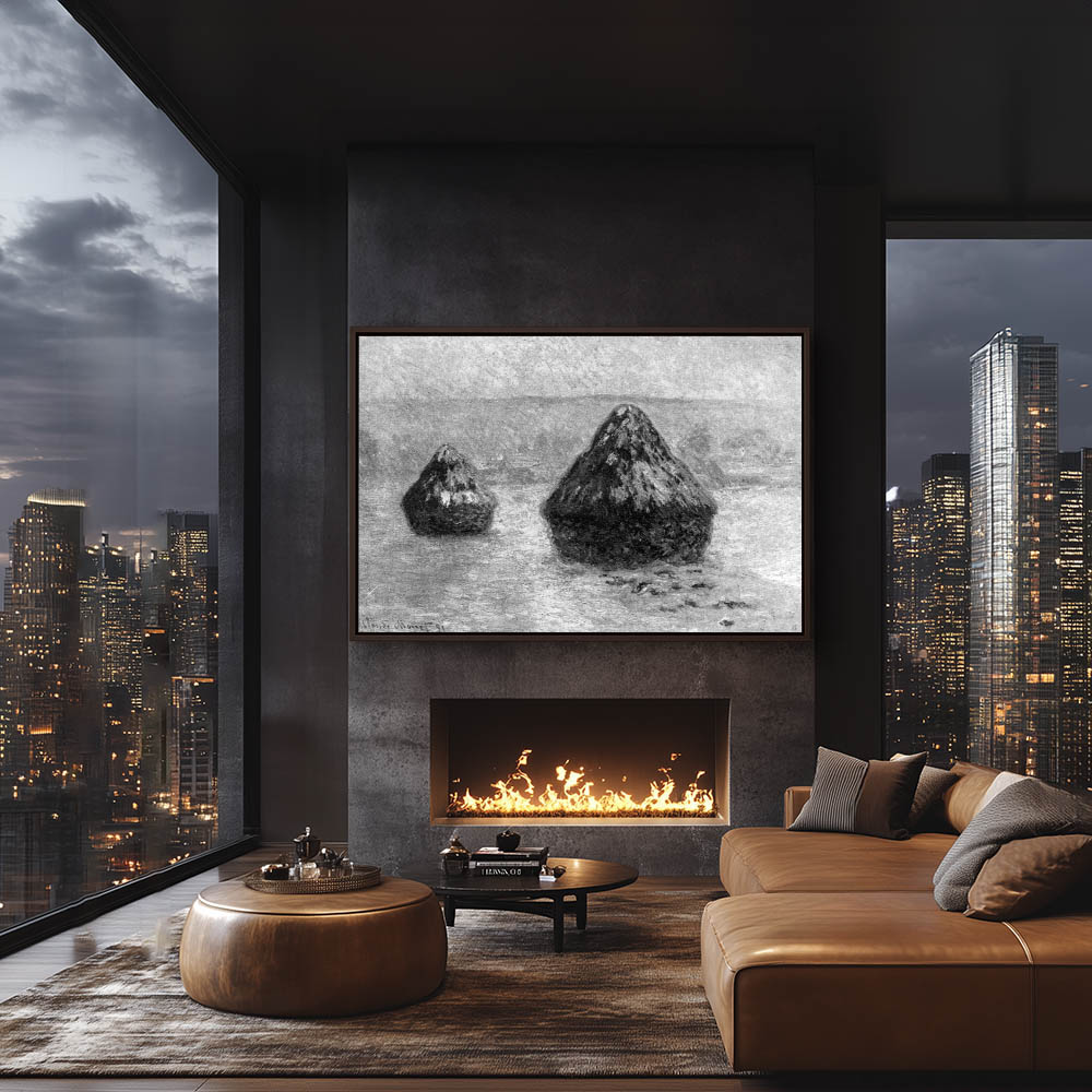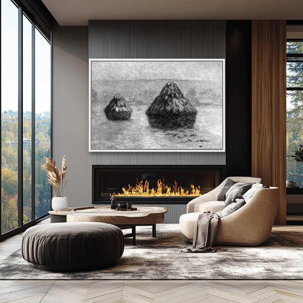 Vintage Landscape Painting in Black and White of a Grainstack in Winter