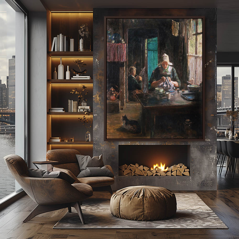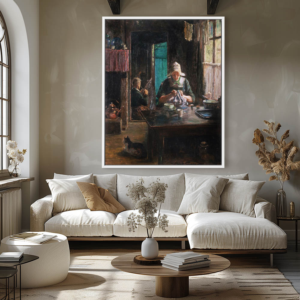 Vintage Figurative Painting with the Artist Grandmother Sewing at the Kitchen Table