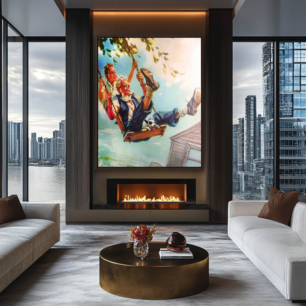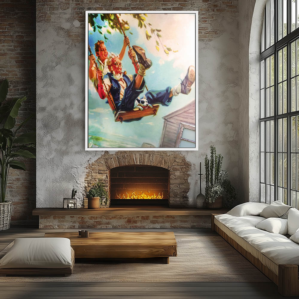 Figurative Painting of Grandpa on a Swing with a Child and a Puppy