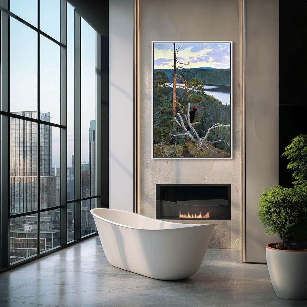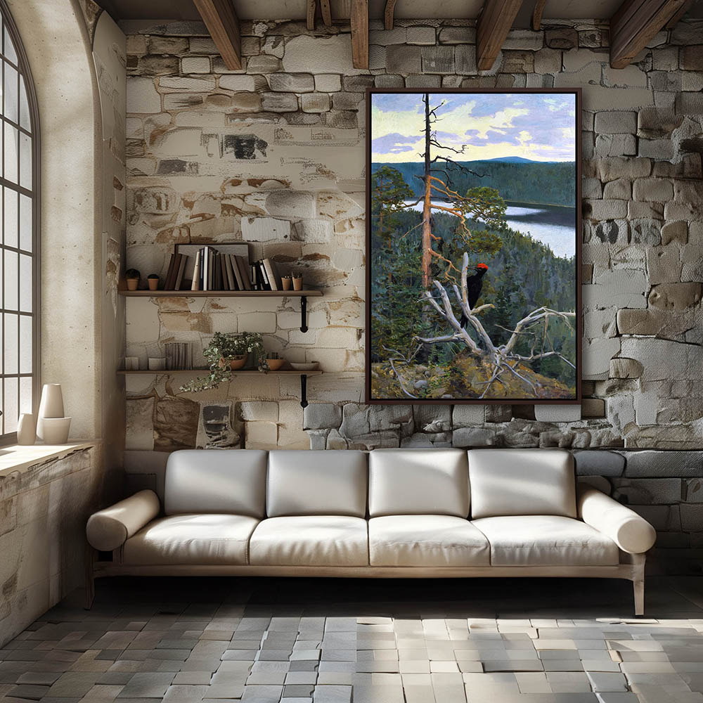 Landscape Painting with a Great Black Woodpecker on a Limb in the Mountains