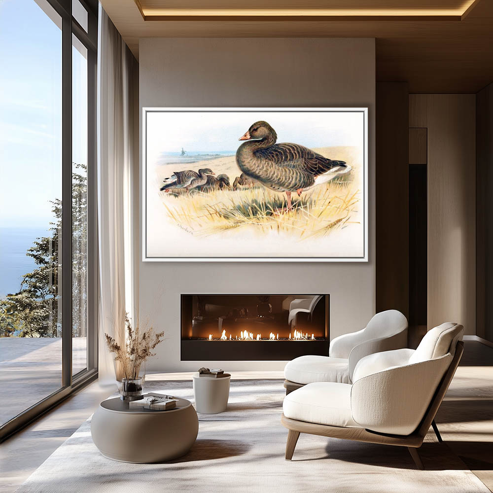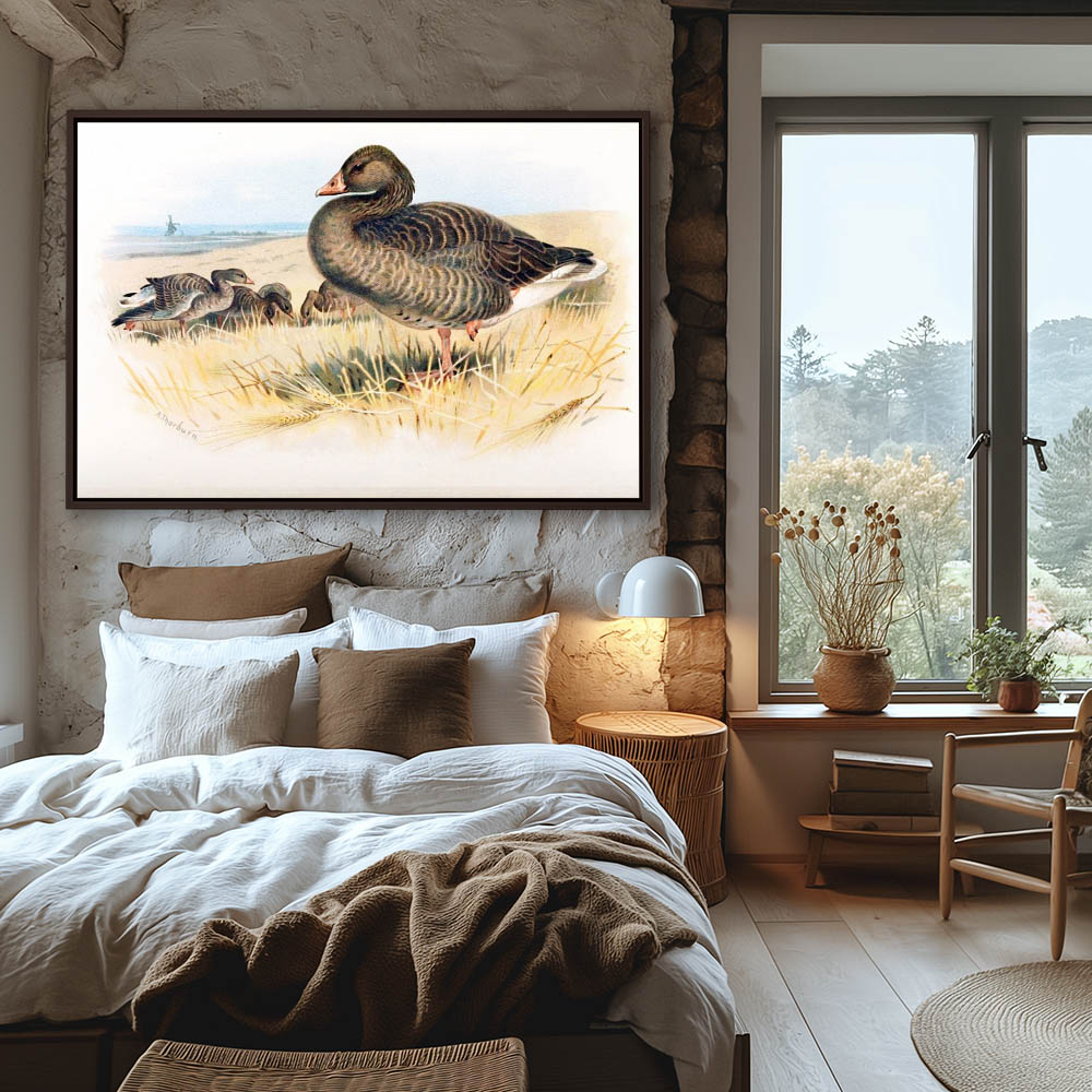 Landscape Painting with Grey Lag Geese Feeding in the Fields