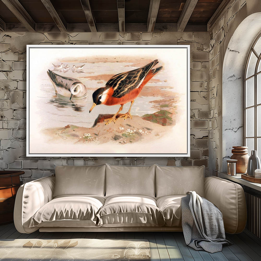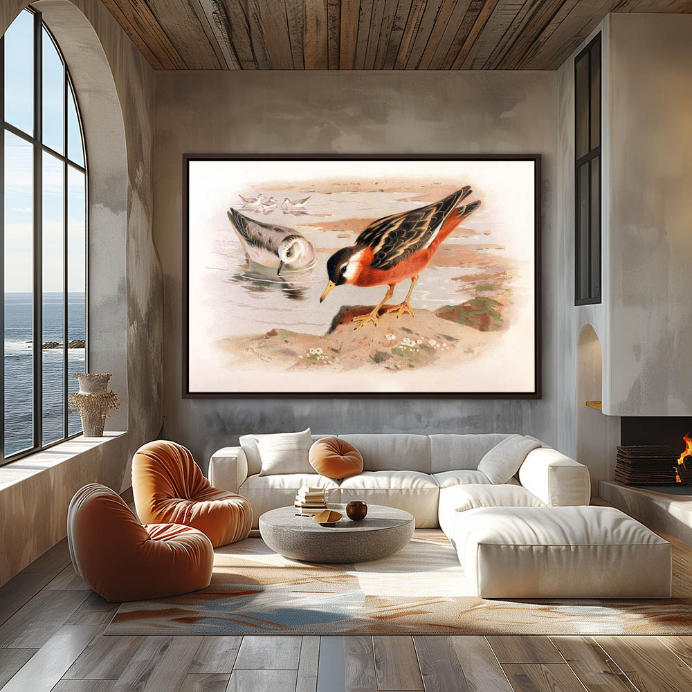 Painting of Gray Phalarope Birds on Shore and in the Shallows