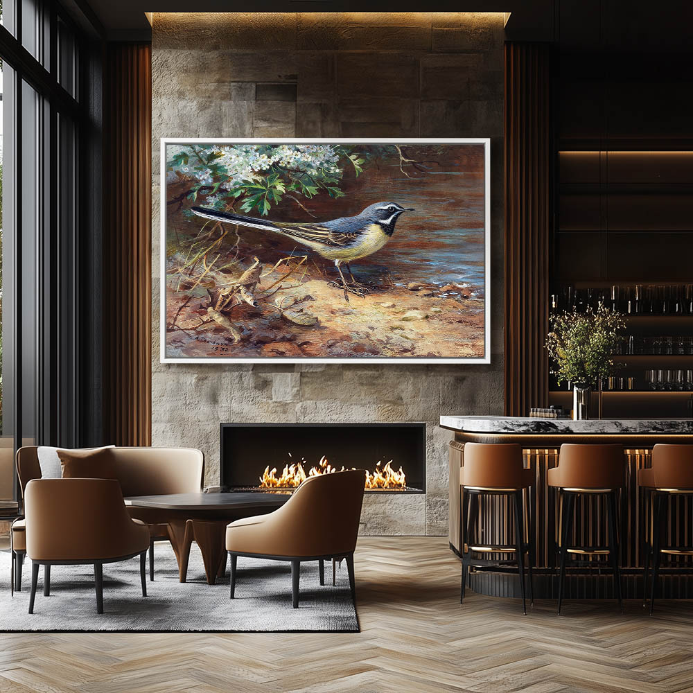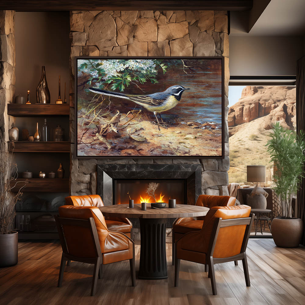Painting of a Bird on the Ground next to a Stream with Flowers