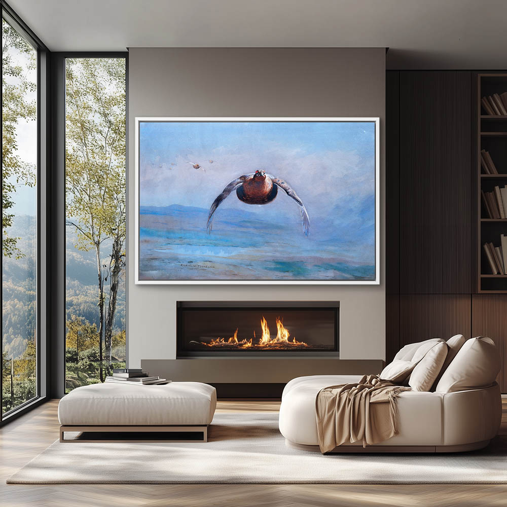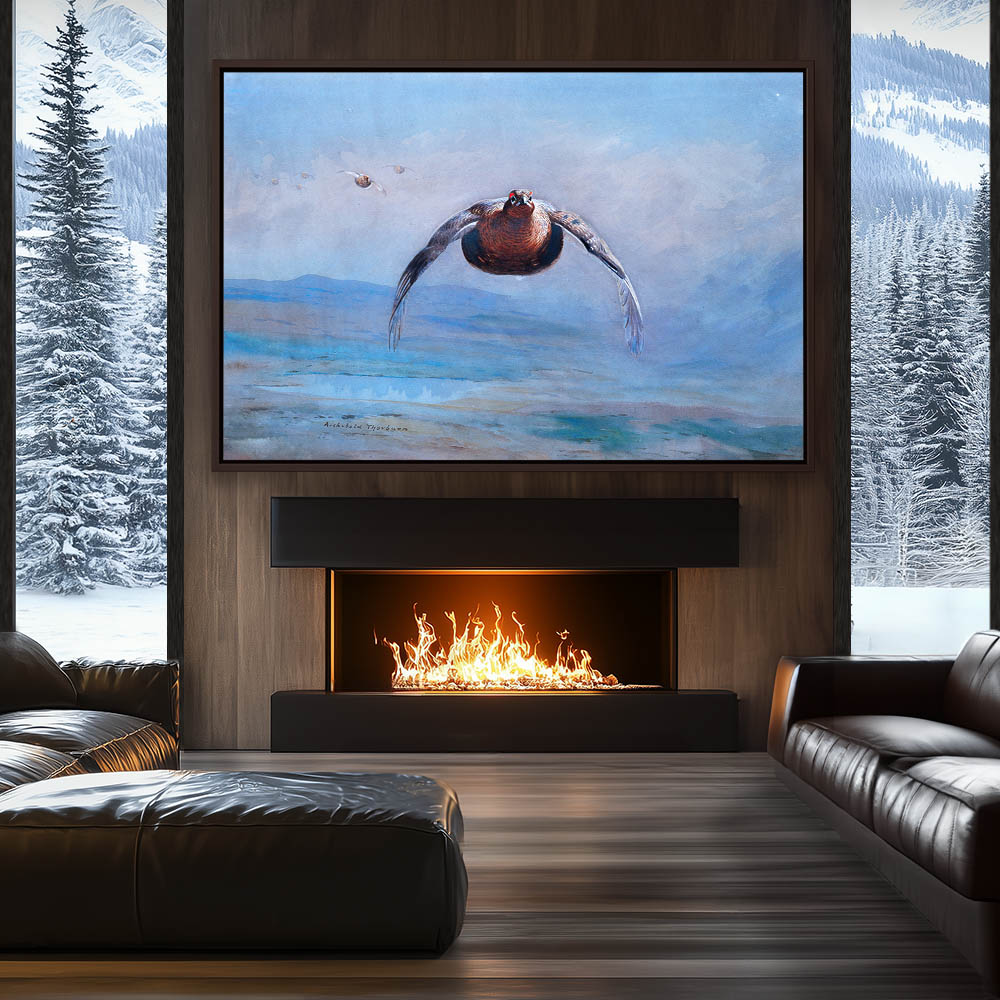 Painting of Grouse in Flight over the Landscape in the Mist