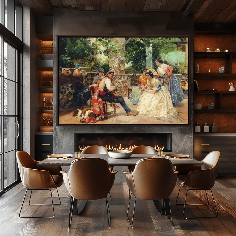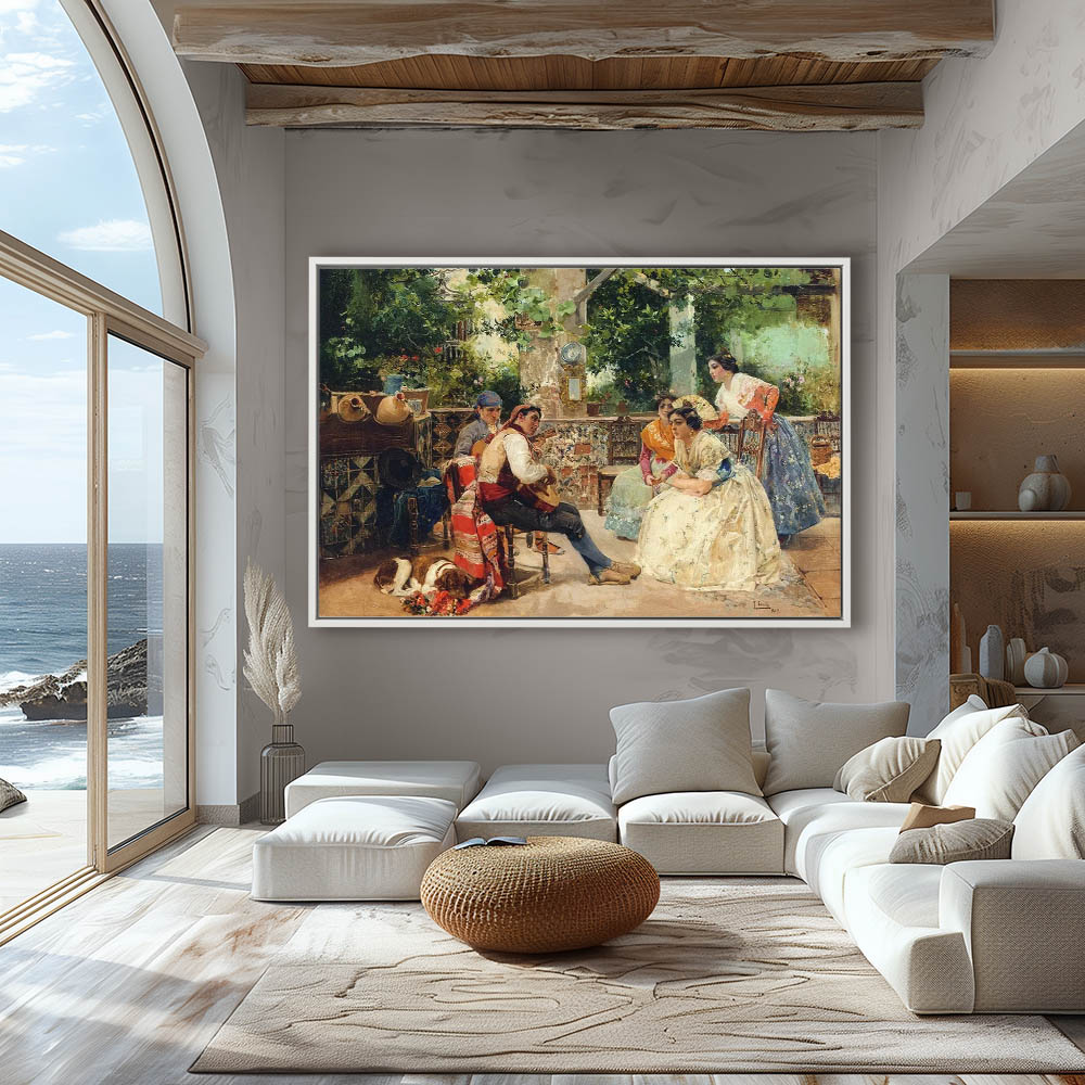 Women in a courtyard listening to a guitarist