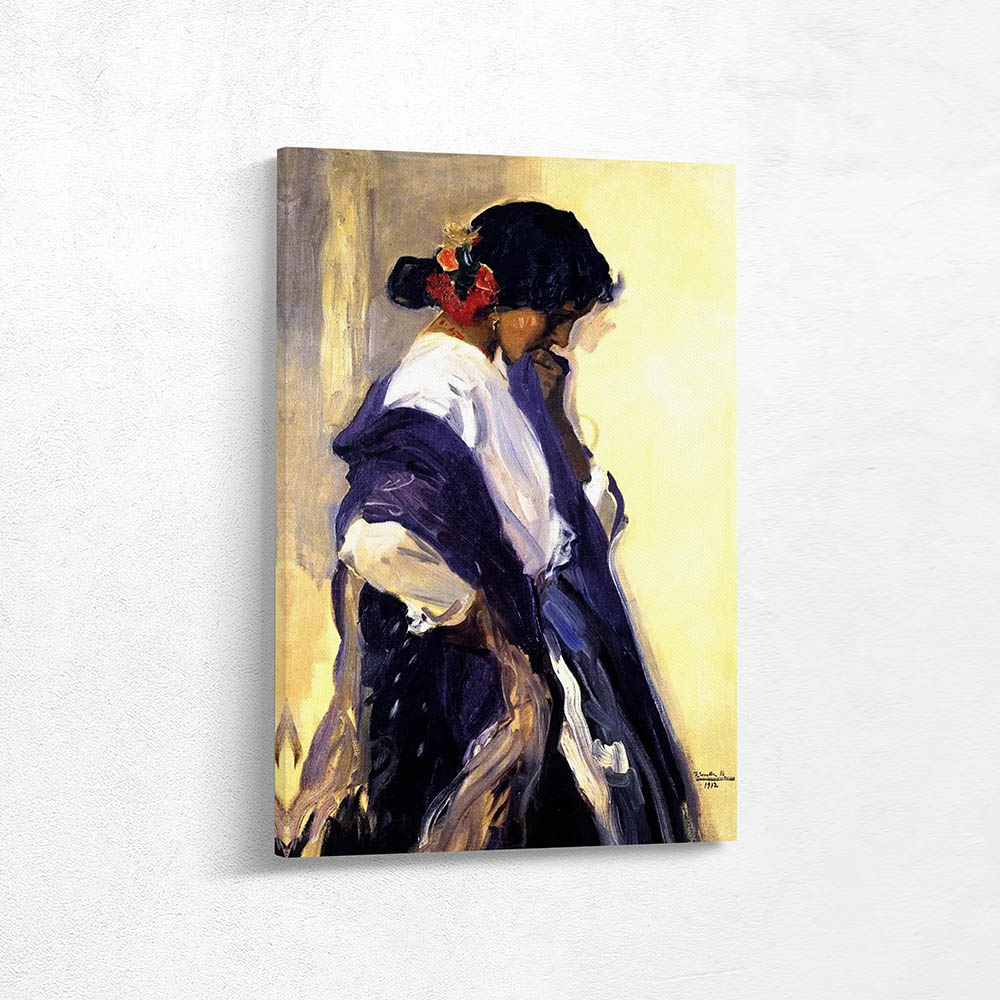 Portrait of a girl in blue scarves with red flowers in her hair, turned in profile
