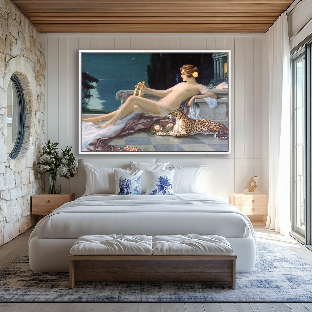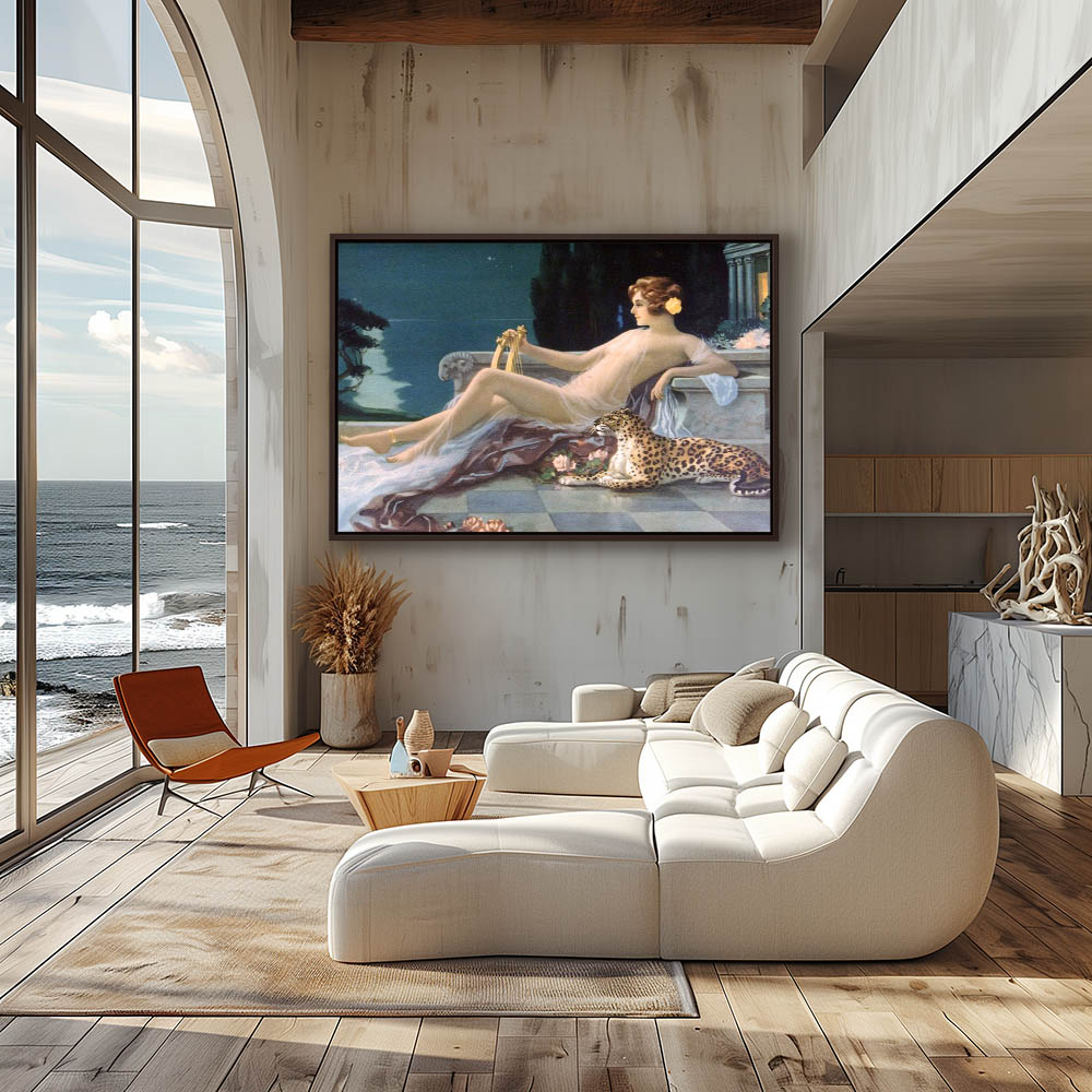 Figurative Painting of a Nude Helen of Troy Reclining on the Balcony with a Leopard