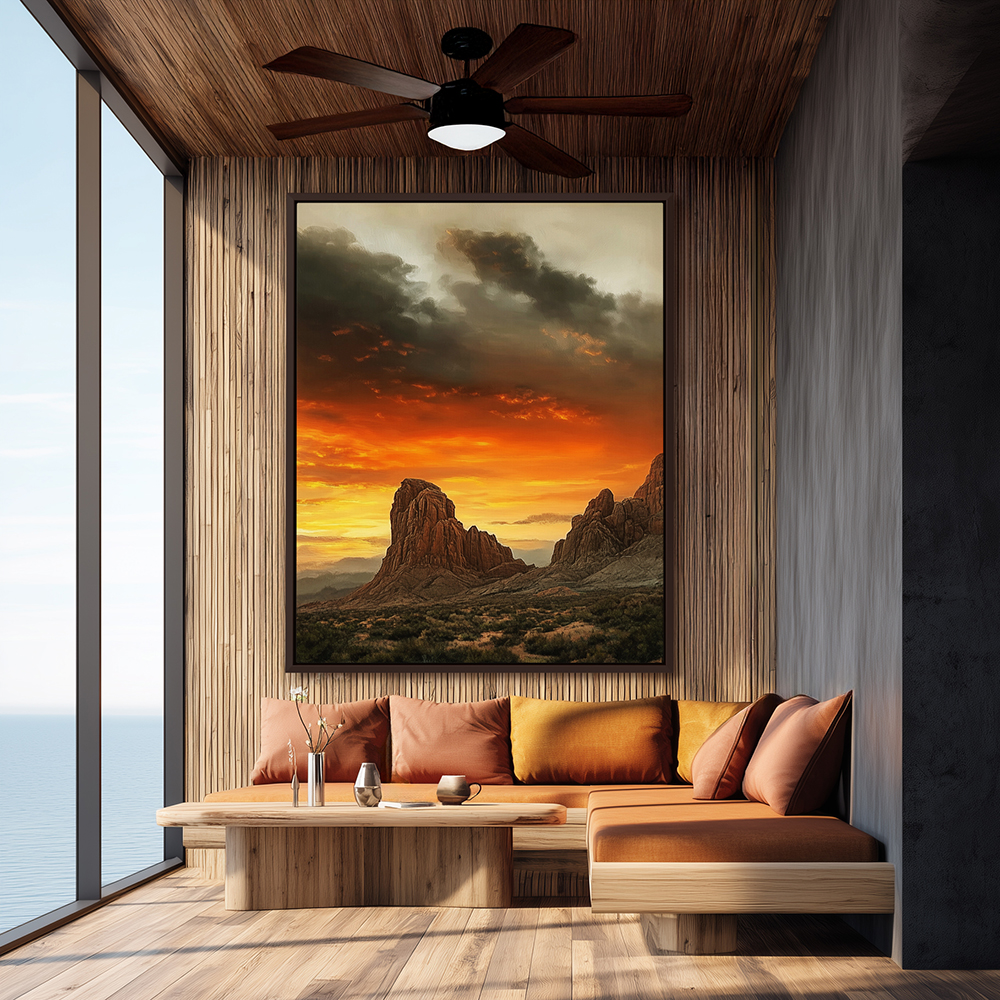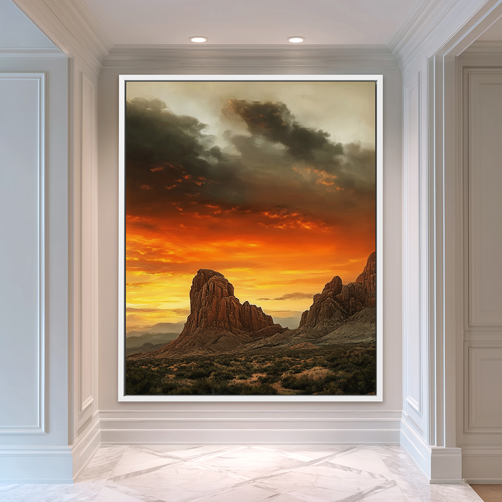 Landscape painting of a sunset over the Desert Southwest with storm clouds. This stunning wall art decor is available in a wide range of sizes and multiple formats, including vinyl wall peel, vinyl peel and stick, metal wall art, metal prints, framed prints, framed wall art, stretched canvas, poster art, poster wall art, poster prints, fine art prints, and framed canvas wall art with floater frames in black, brown, and white.