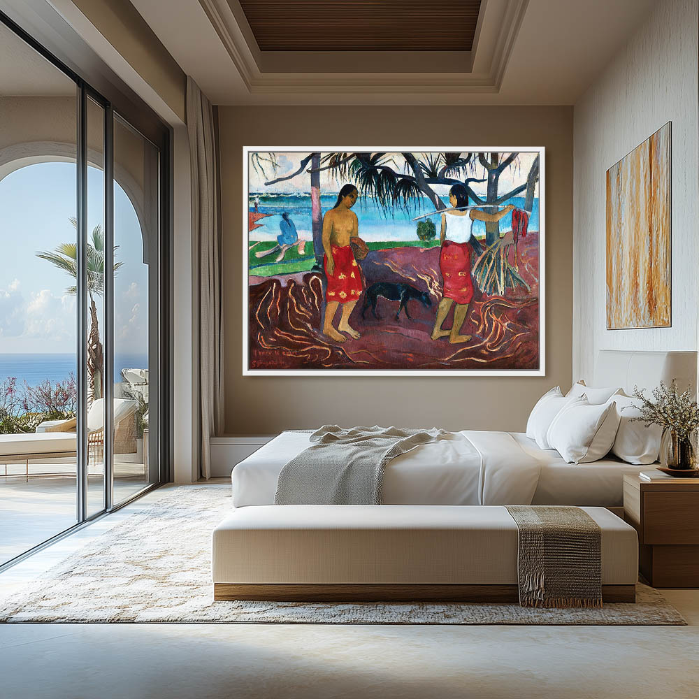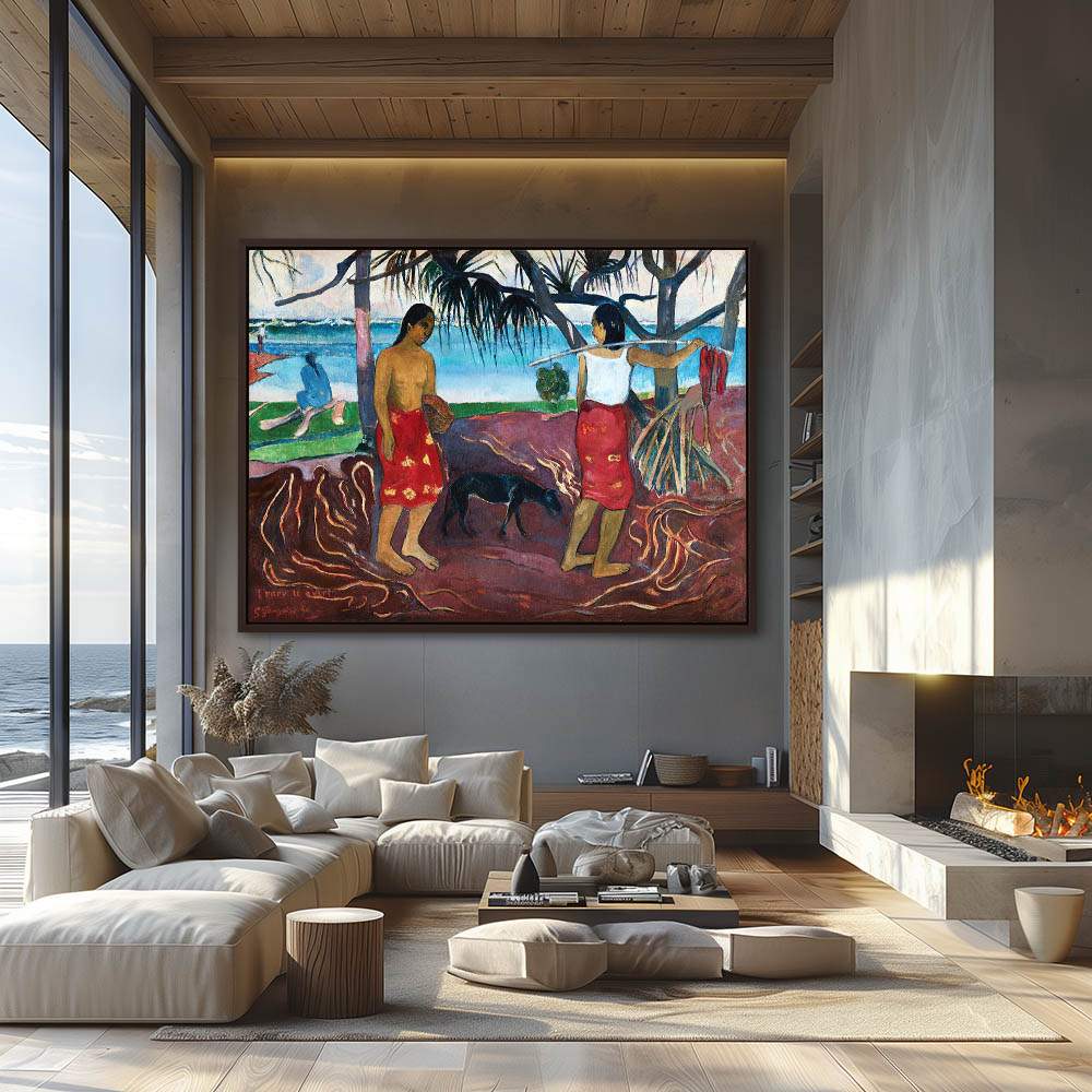 Vintage Seascape Painting with Figures and a Dog on Shore