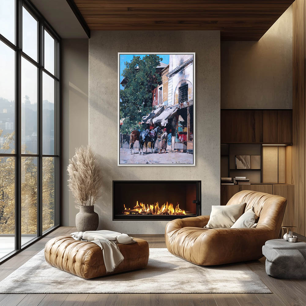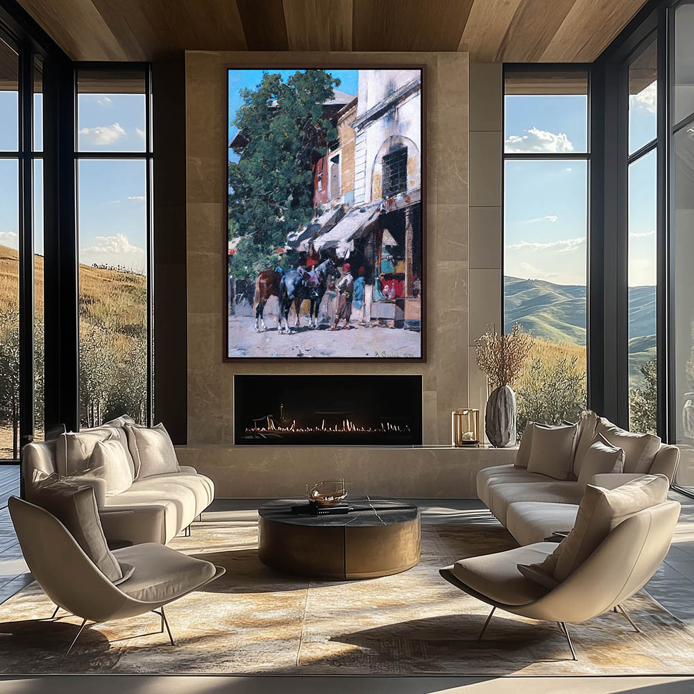 Landscape Painting of Figures with Horses in Front of the Market