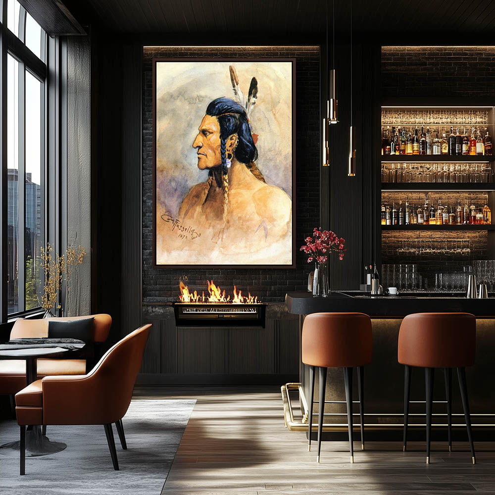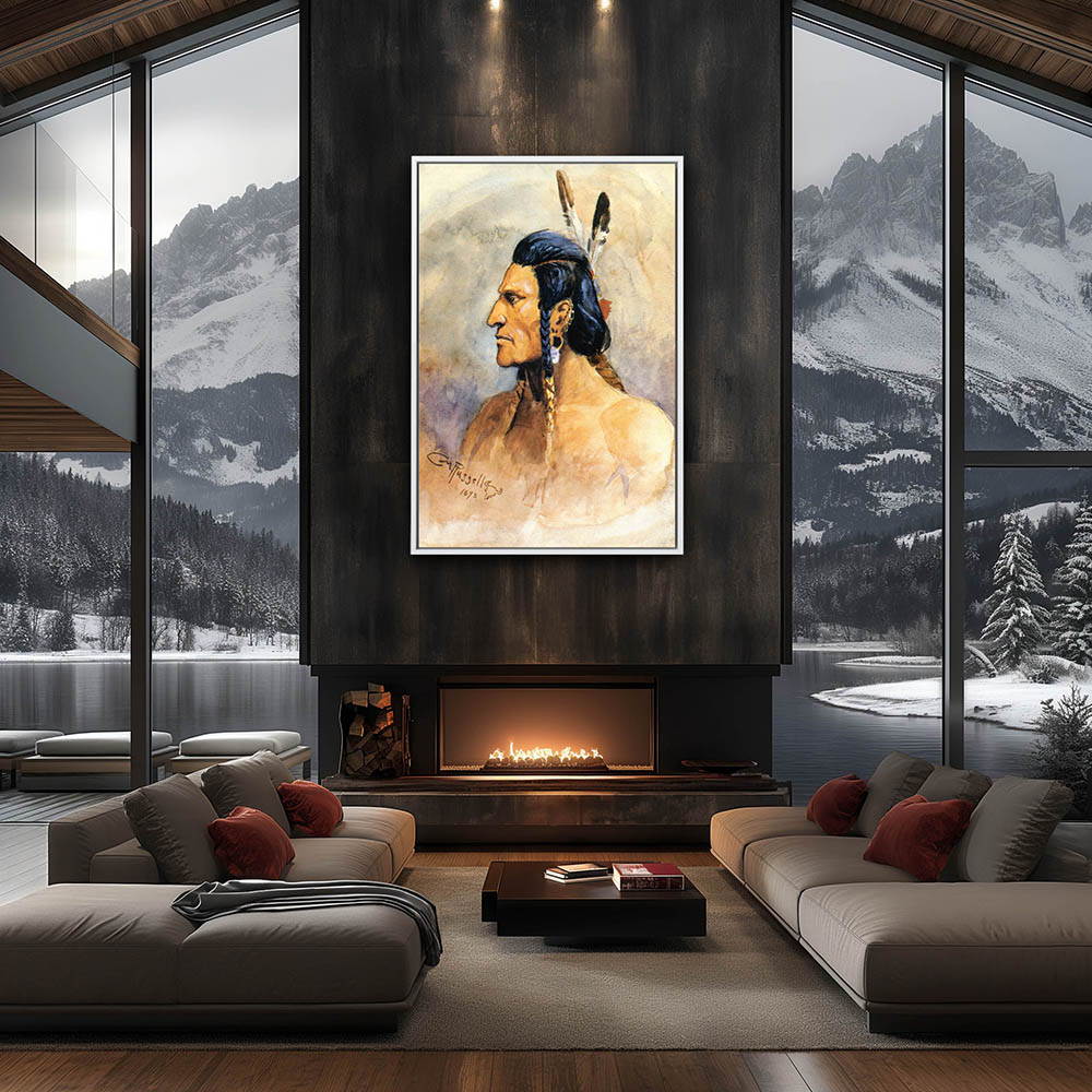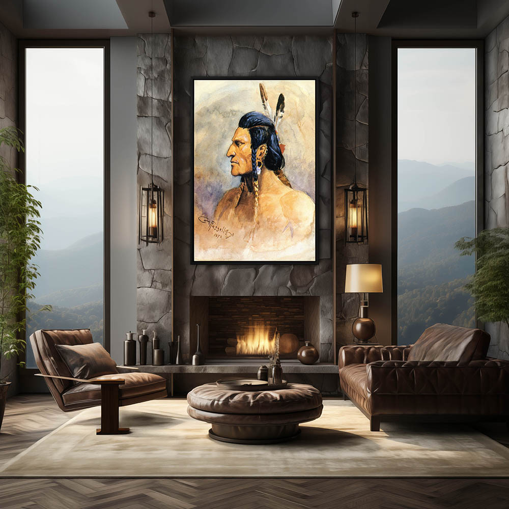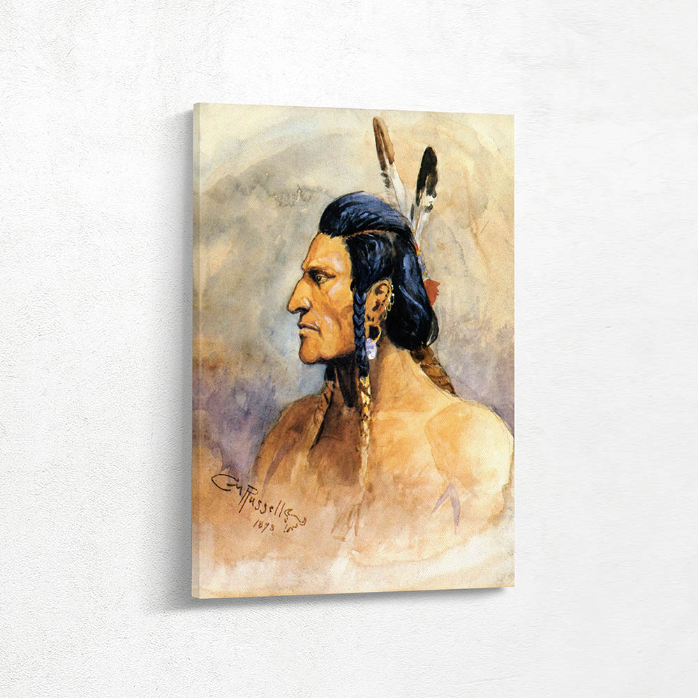 Portrait of an Indian Brave with braids and feathers in his hair