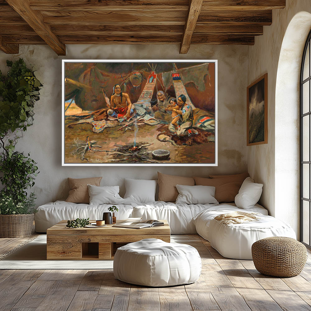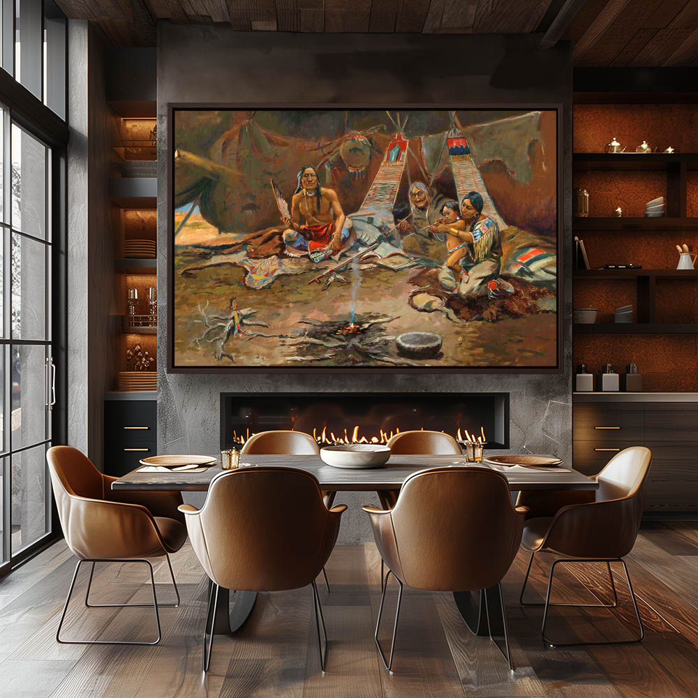 Indian family in their teepee sitting around the fire smoking a pipe and playing with a child