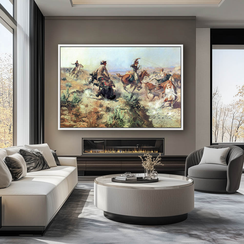 Cowboys roping cattle and getting the rope snagged to pull down a horse