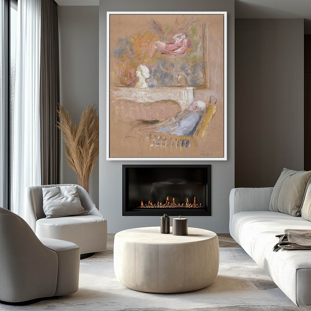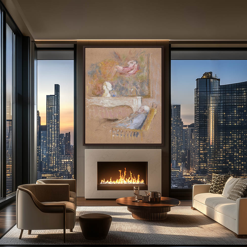 Man reclining in a chair in front of a mamtle with a scupture and painting (Dianes Rest)