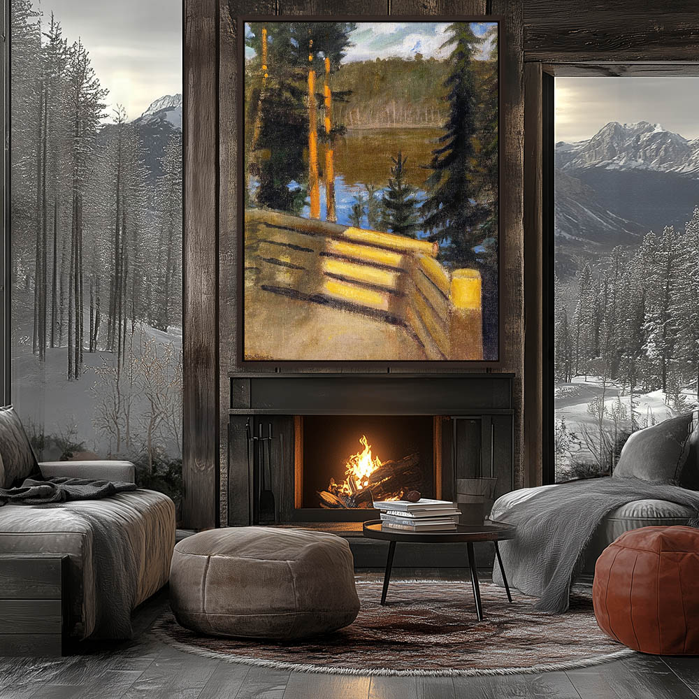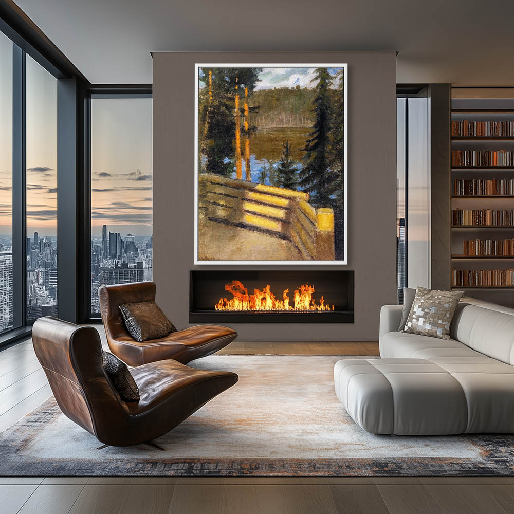 Landscape Paintingof a Lake View from the Cabin Porch with Trees