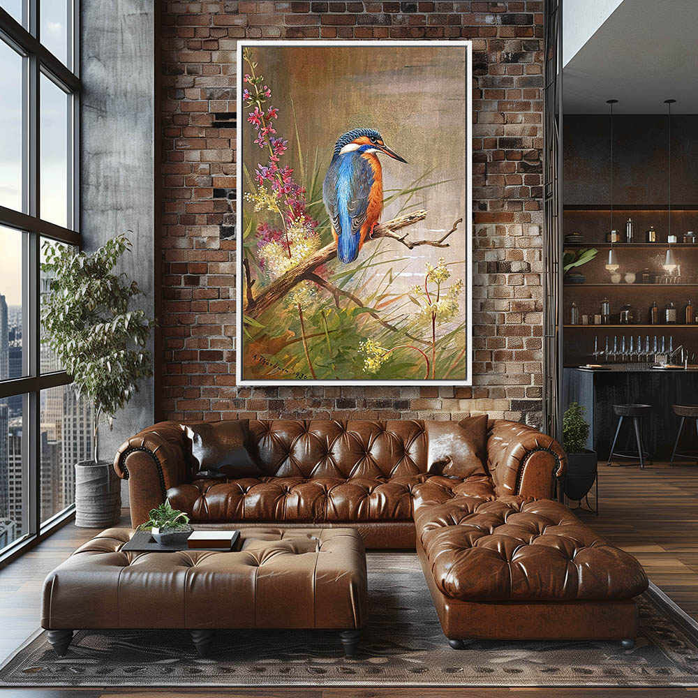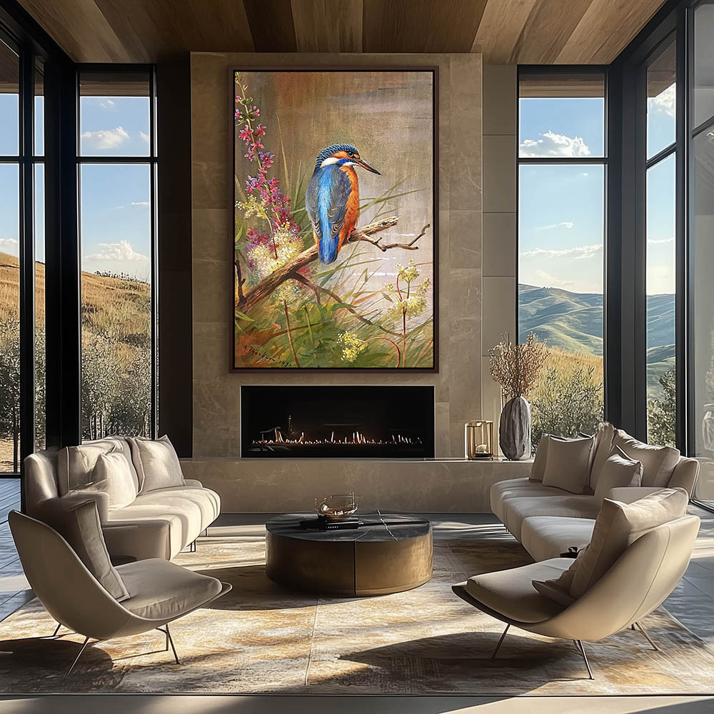 Painting of a Kingfisher Perched on a Limb on the Bank