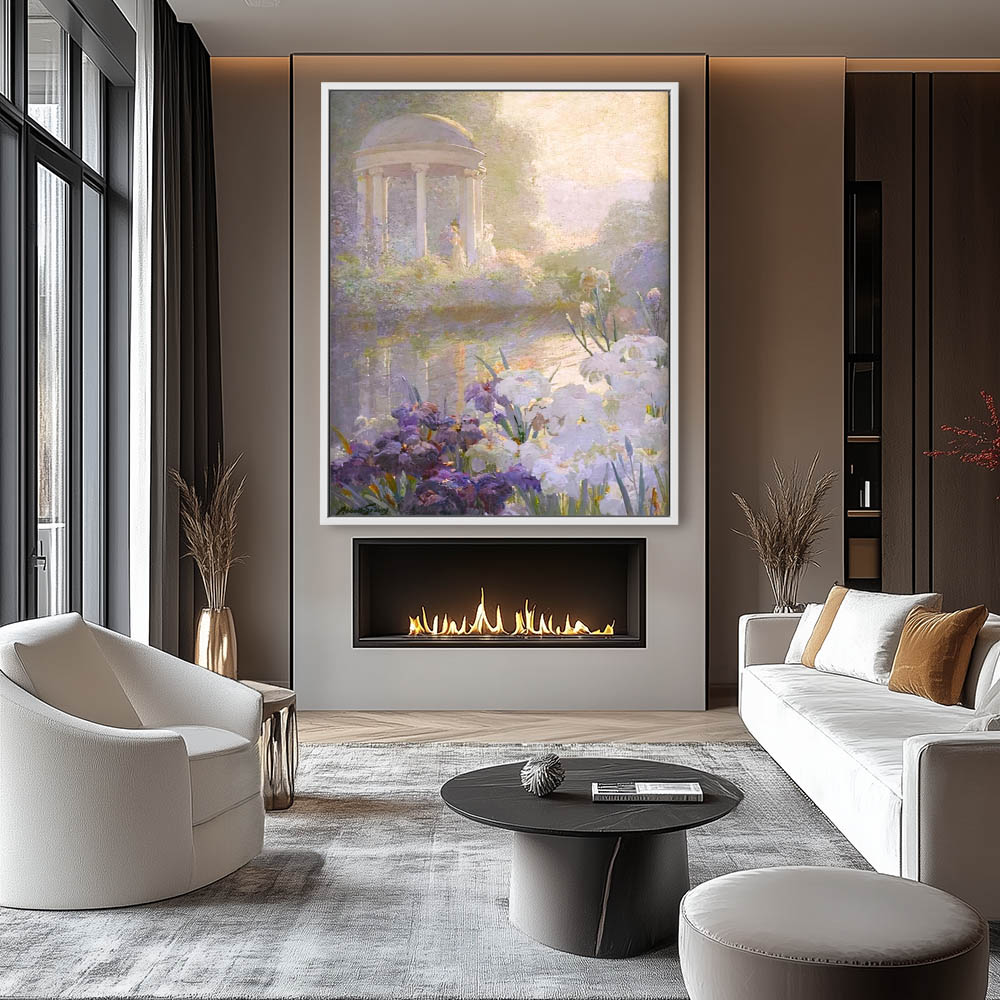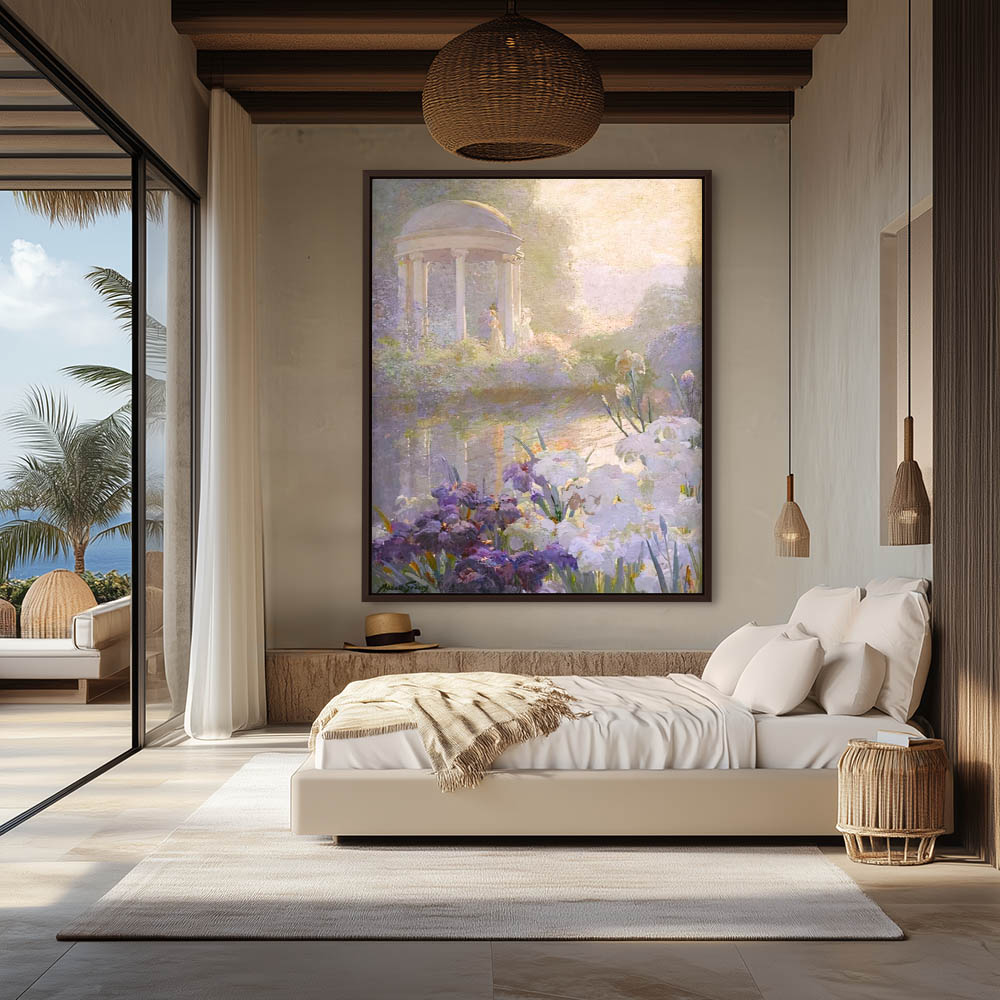 Vintage Flower Painting with Two Ladies in the Gazebo at Sunset