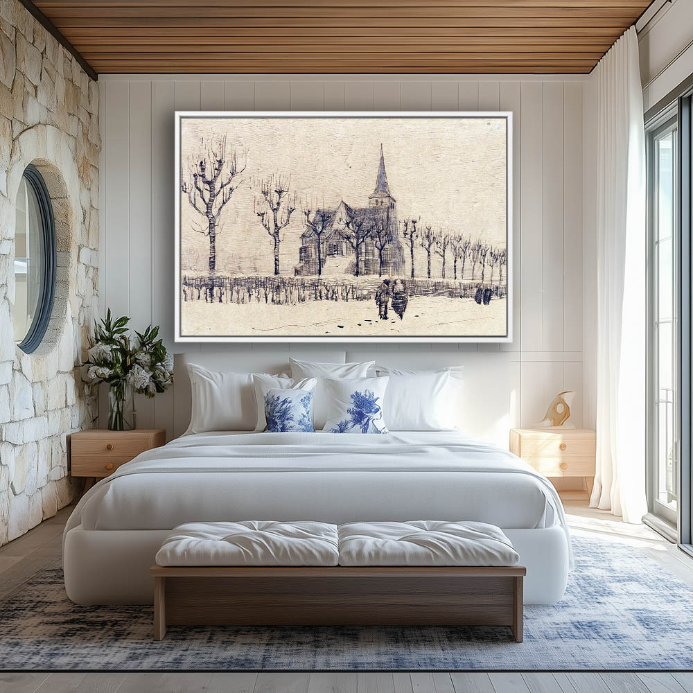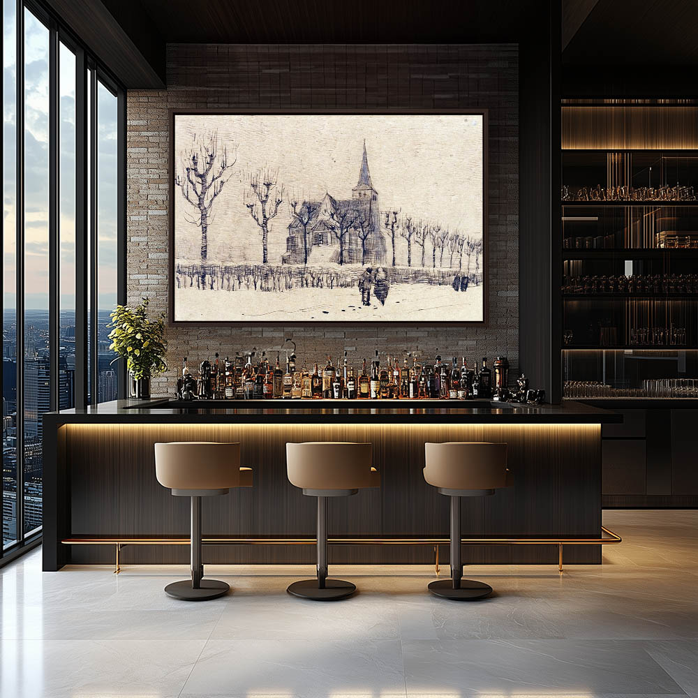 Impressionist Drawing of a Church with Figures Walking a Tree Lined Path