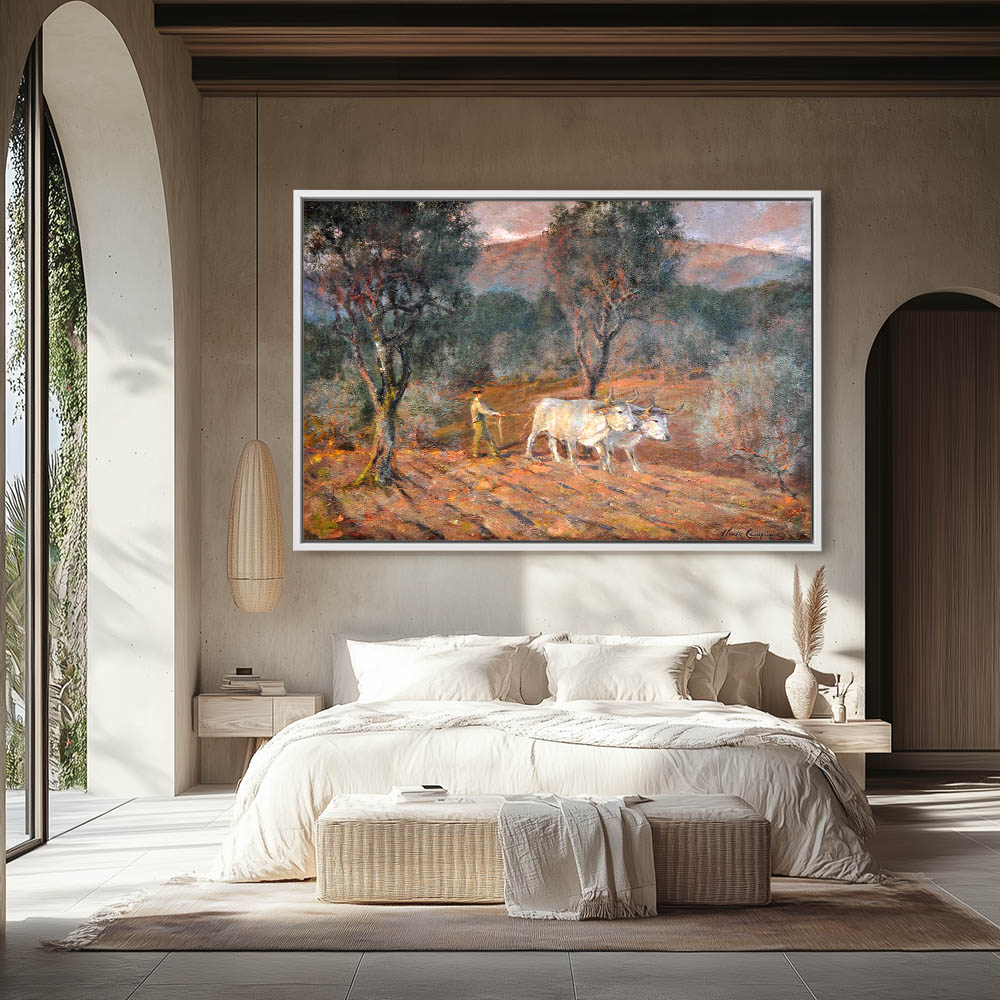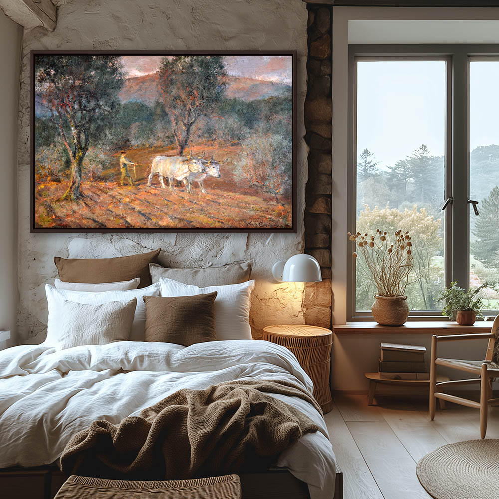 Landscape Painting with a Man Plowing behind Oxen
