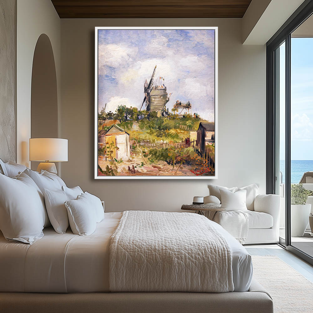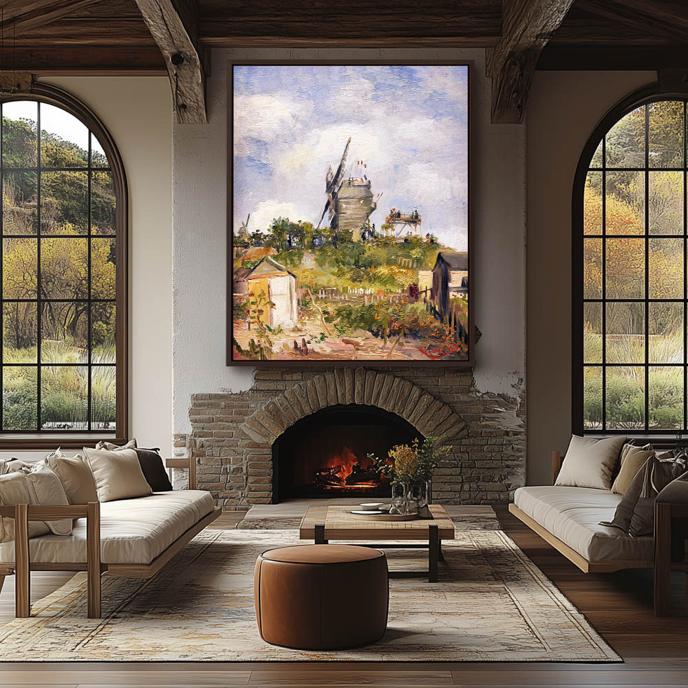Impressionist Landscape Painting with Shacks and Two Windmills on the Hill