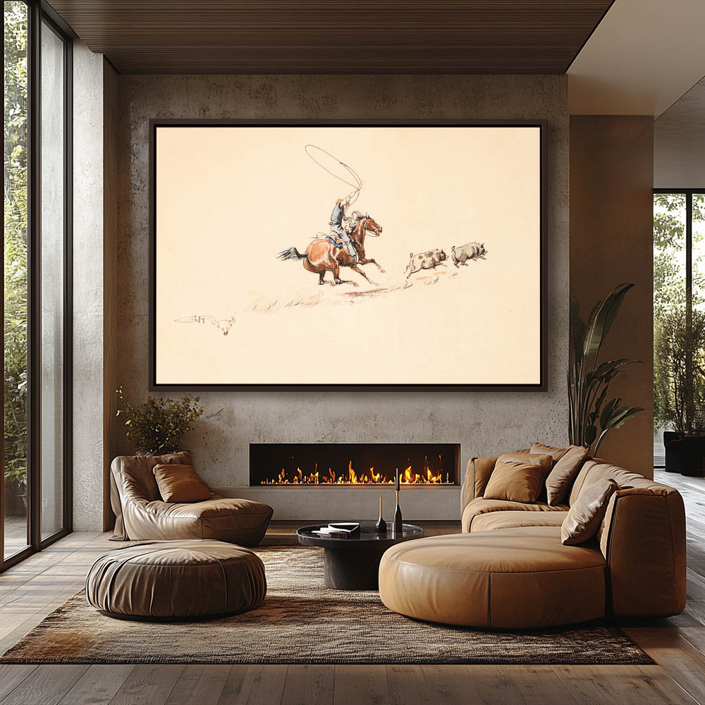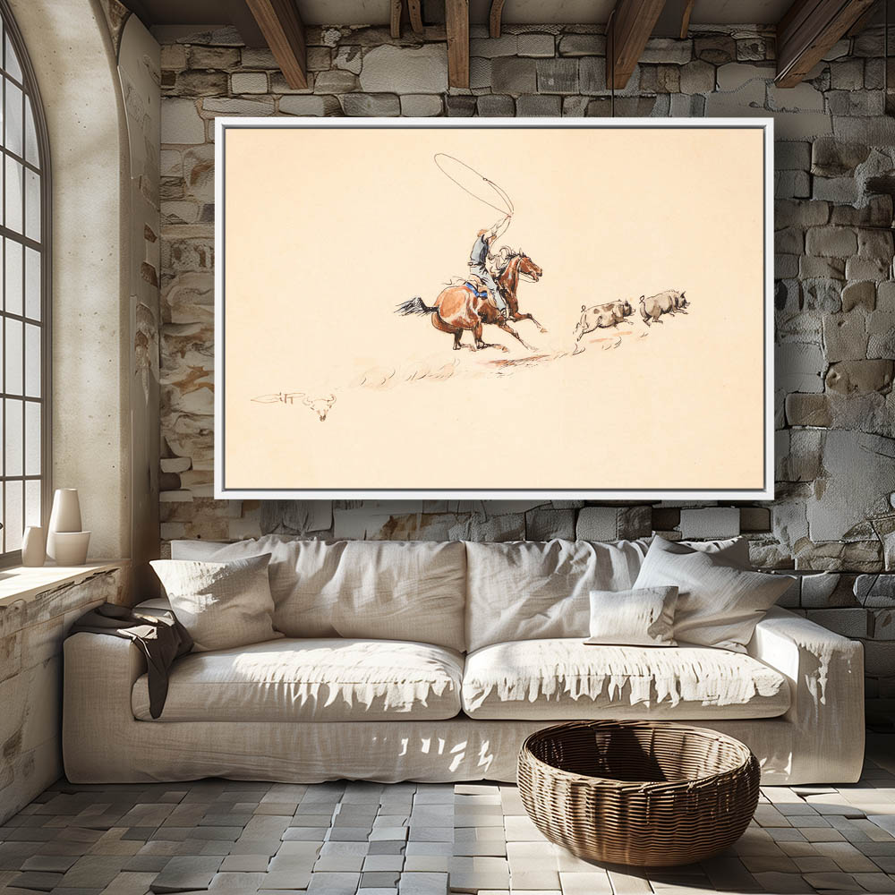 Colored sketch of a Cowboy roping pigs