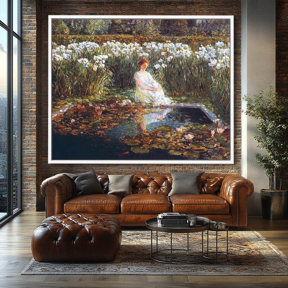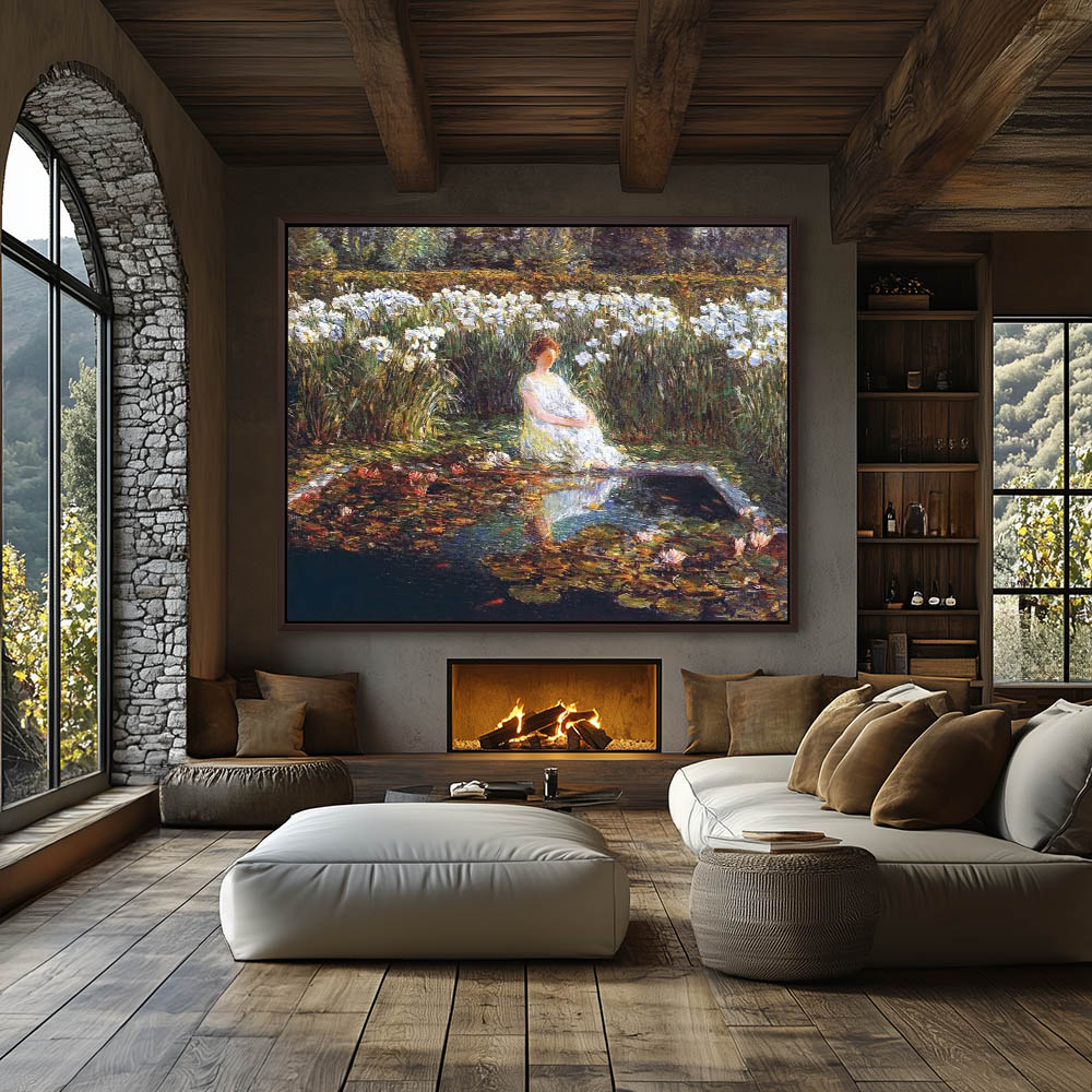 Vintage Flower Painting with a Figure Sitting by a Pond near the Water Lilies