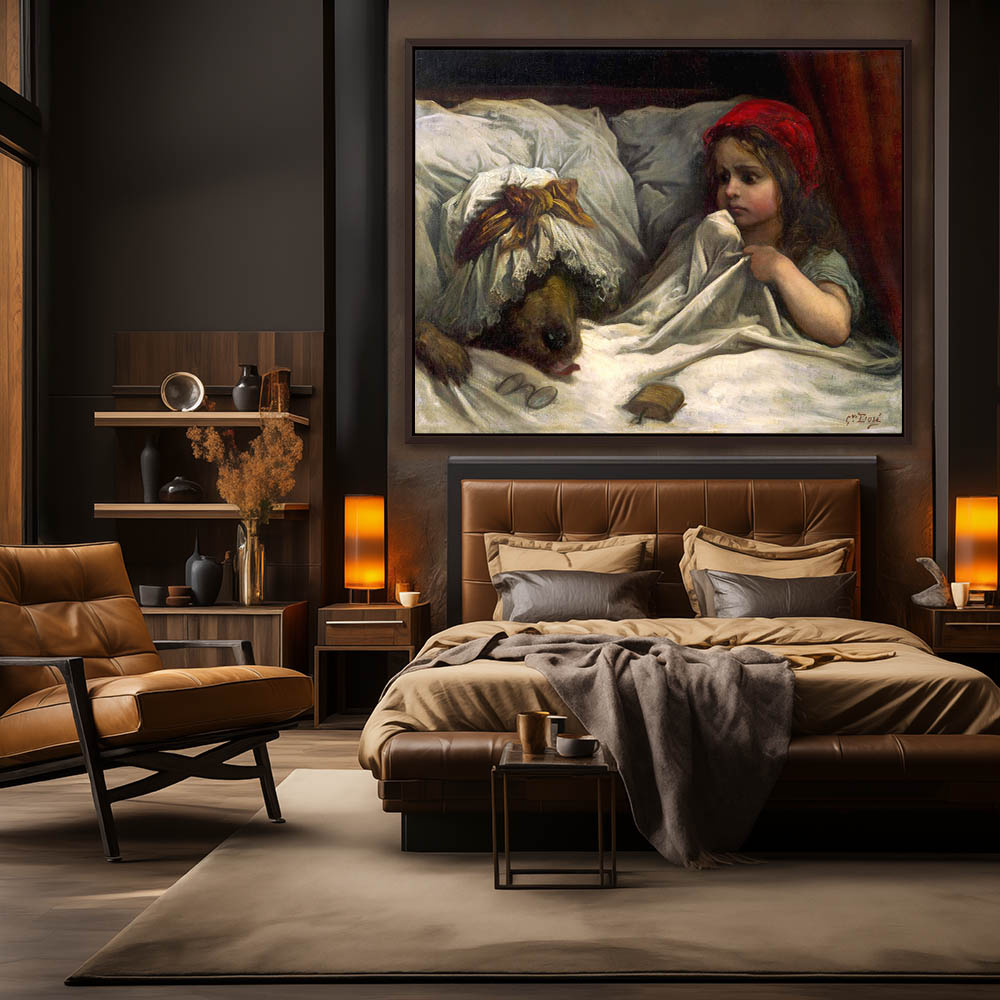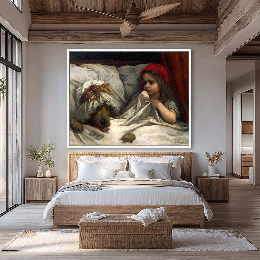 Little red riding hood in bed next to the wolf in her grandmothers nightcap