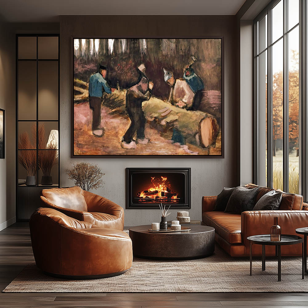 Impressionist Painting of Figures Working as Loggers in the Forest