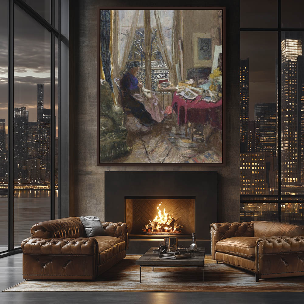 Woman in violet dress sewing in front of the window showing a snowy day outside