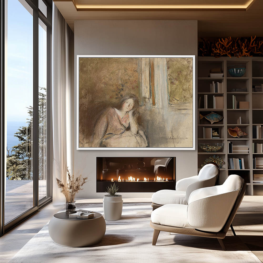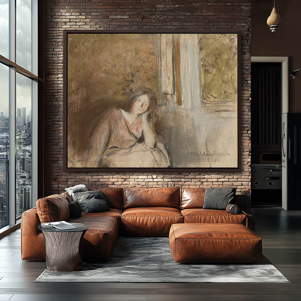 Young woman sitting with her elbow resting on her lap and her hand cradling her tilted head