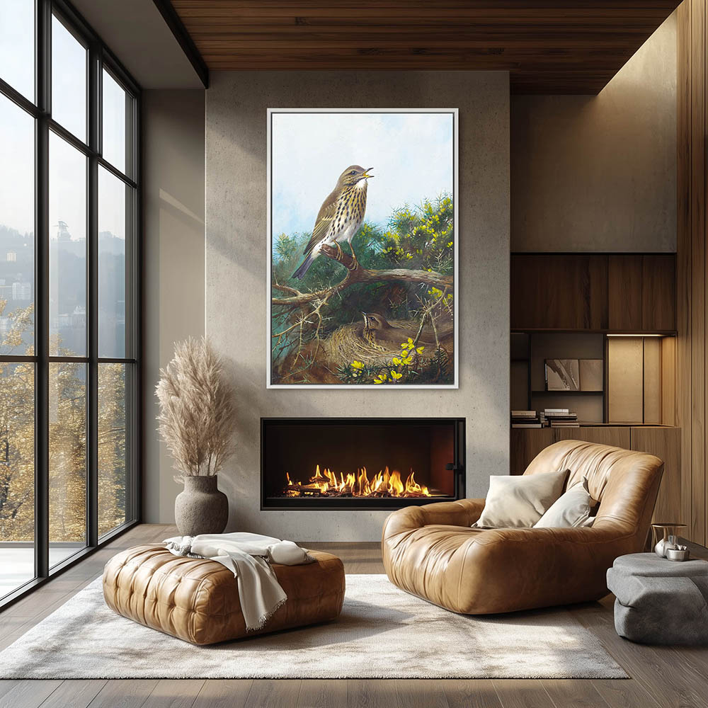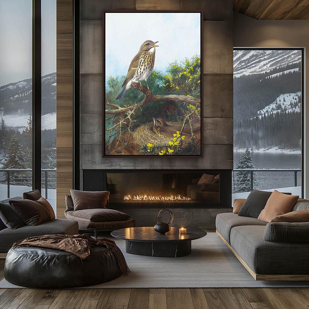 Painting of Birds with a Nest in the Shrubs with Flowers