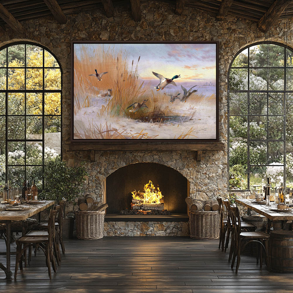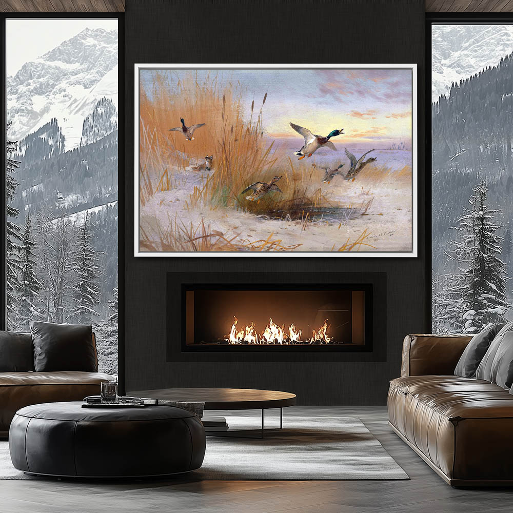 Painting of Mallards Taking Flight from a Fox in the Reeds