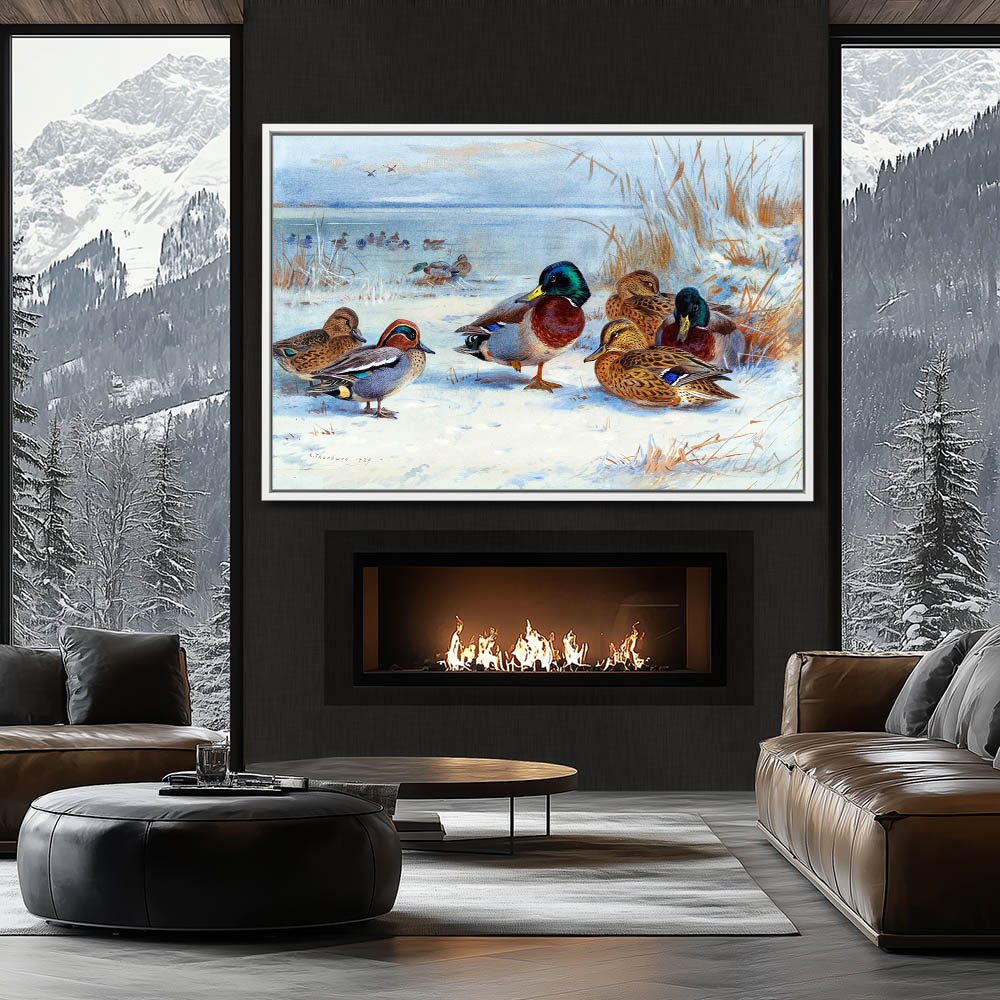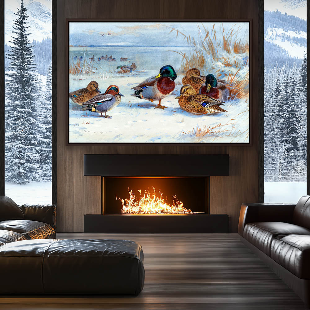 Winter Frozen Landscape Painting with Ducks Resting on the Ice and Water