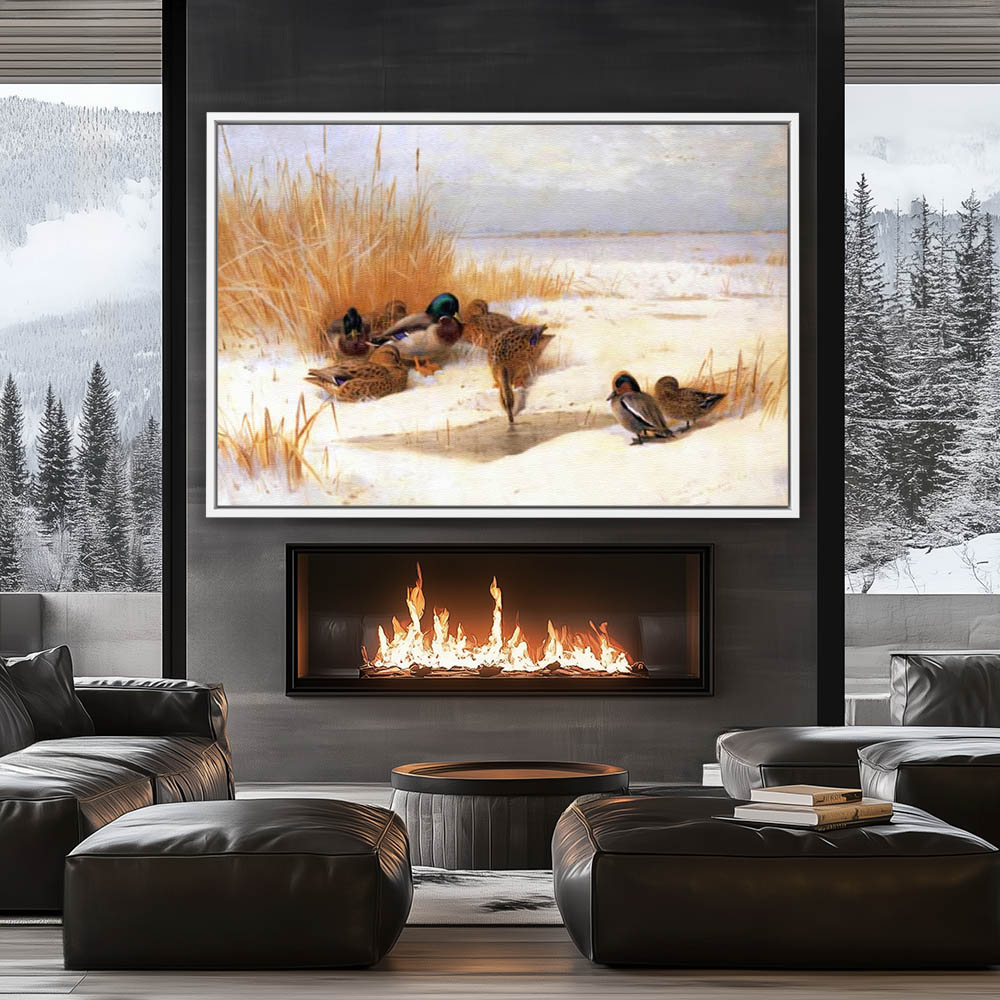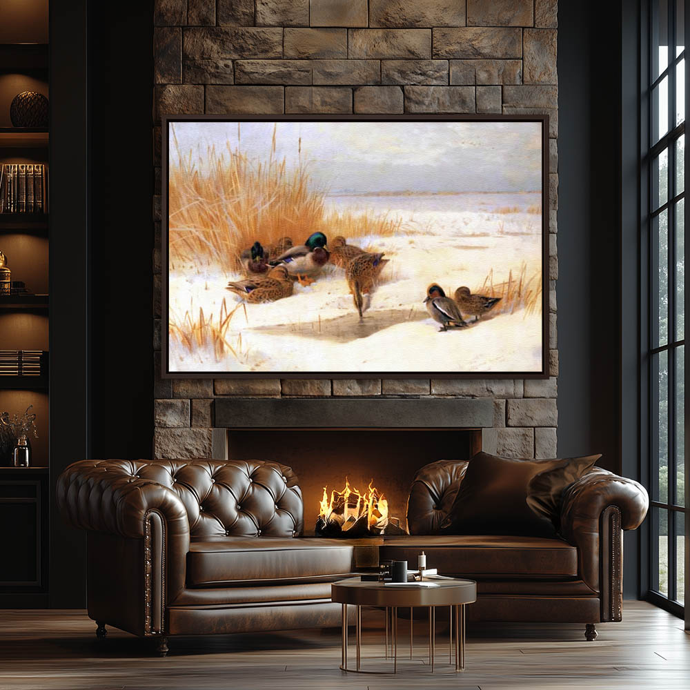 Snowy Marsh Landscape Painting with Mallard and Teal Ducks on the Snow