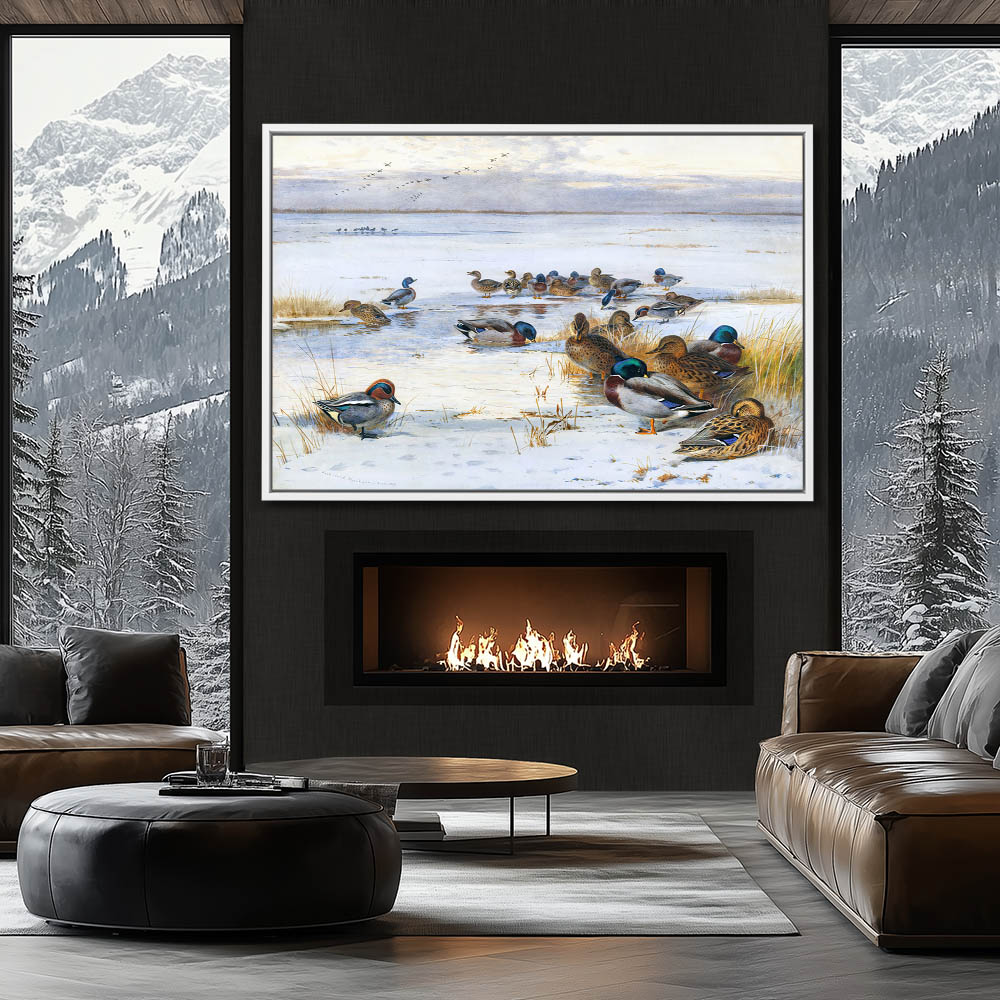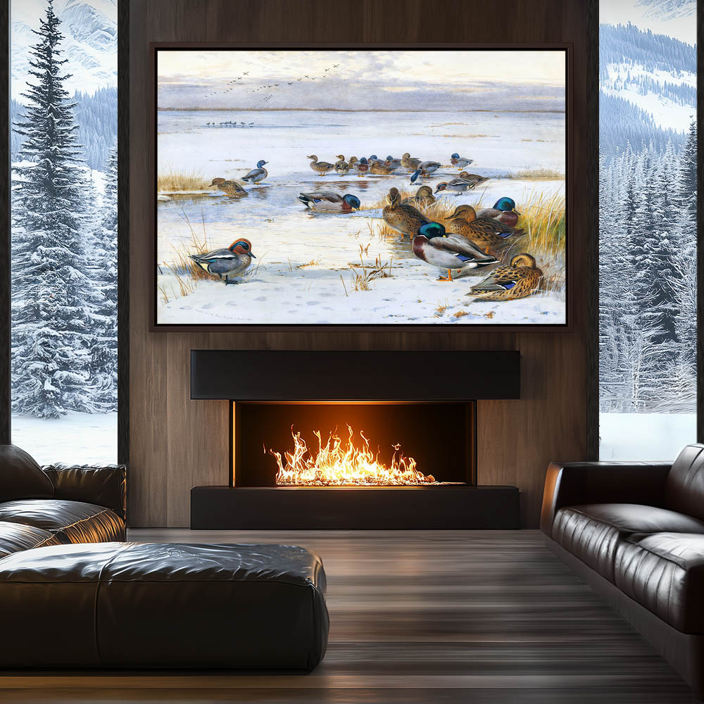 Frozen Marsh Landscape Painting with Ducks Resting on the Ice