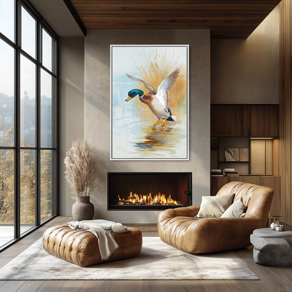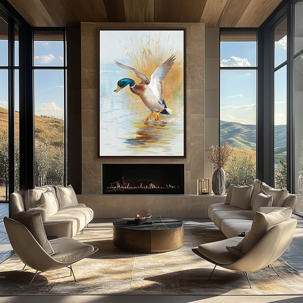 Painting of a Mallard Duck Landing in the Water among the Reeds