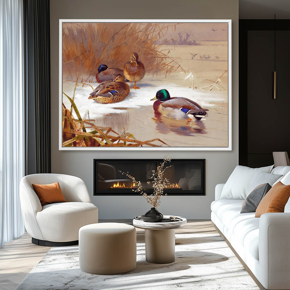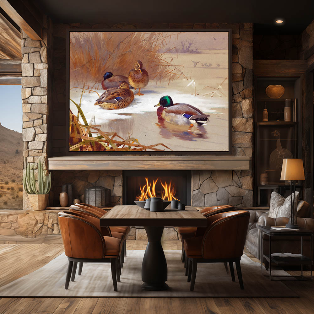Painting of Mallard Ducks on a Frozen Lake in Winter
