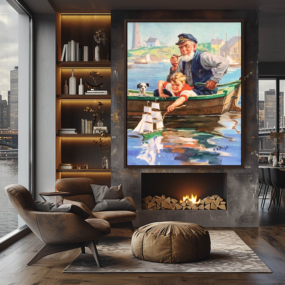 Figurative Painting of Grandpa and Child on a Boat with a Puppy