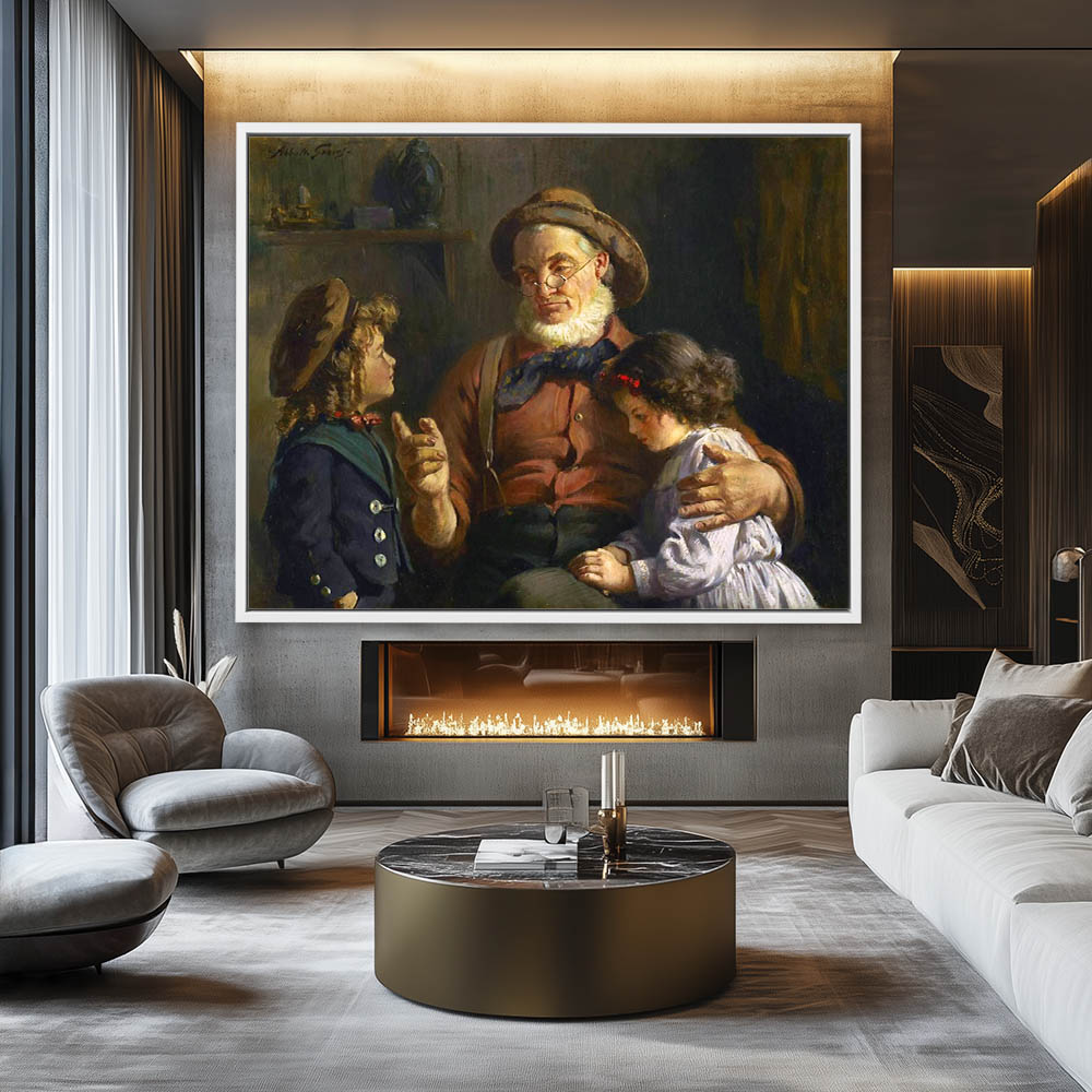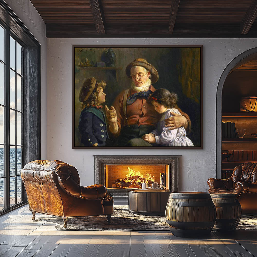 Vintage Figurative Painting of Grandpa Reading to the Children
