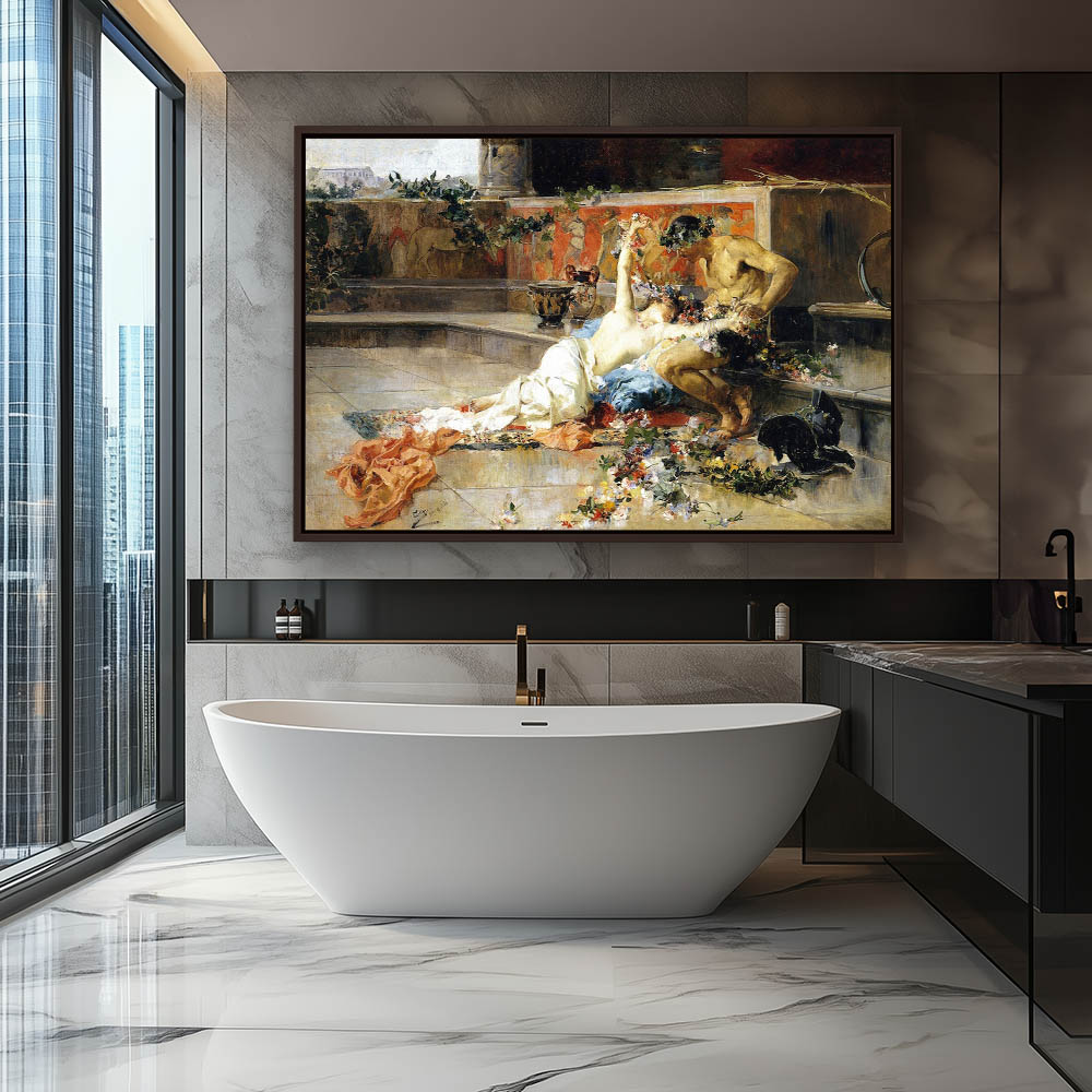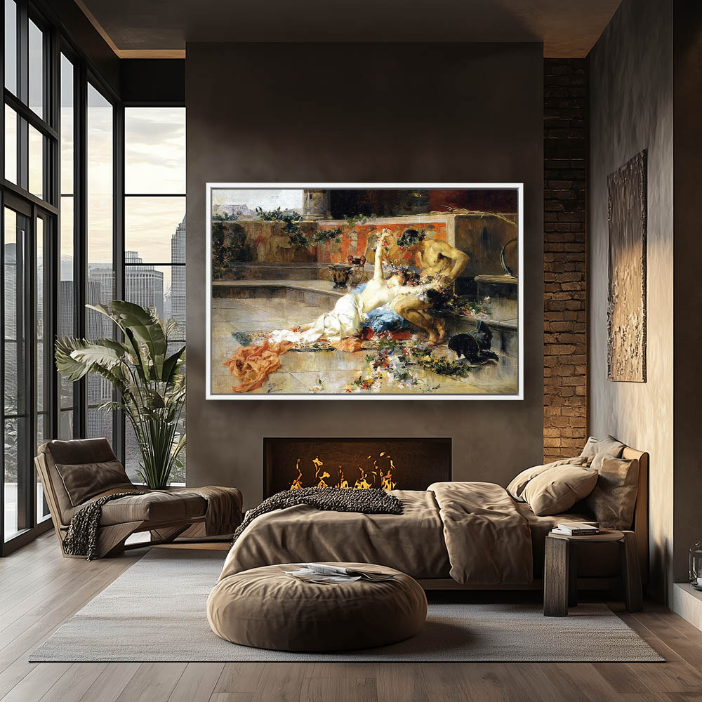 Female nude lounging with a shirtless gladiator who’s helmet has been replaced by a floral crown