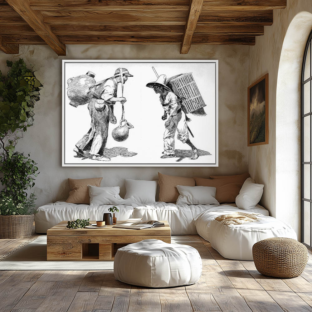 Illustration of men with baskets and jugs strapped to their backs for carrying loads